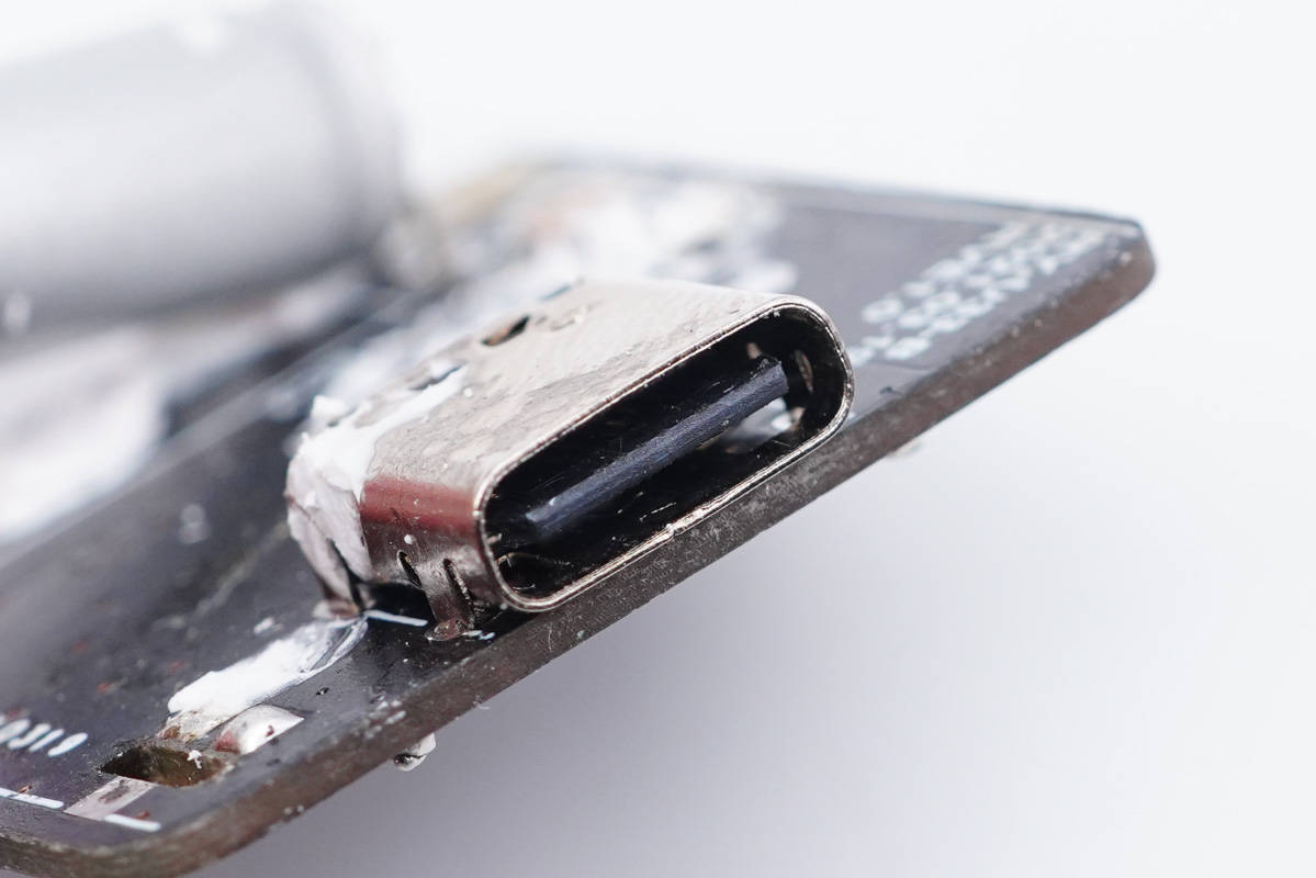 USB-C母座特寫,過孔焊接。