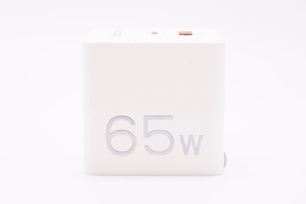 羽博這款65W氮化鎵充電器采用方塊造型設計,腰身啞光和亮面結合設計,各面之間過渡圓潤,正面鑲嵌65W功率字樣亮銀金屬片。