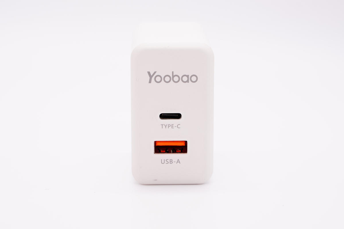 輸出頂面印有YOOBAO品牌,并配有1A1C接口,USB-C口黑色膠芯不露銅,USB-A口橘紅色膠芯。