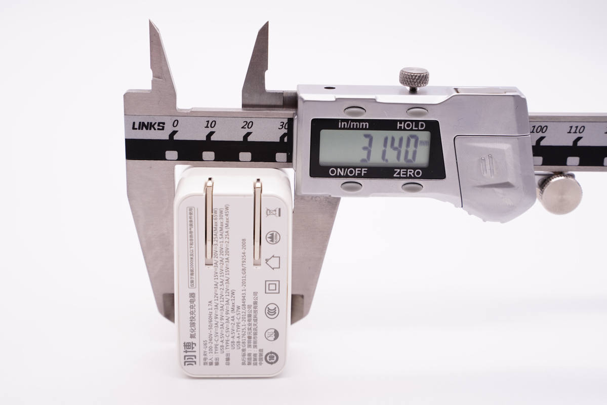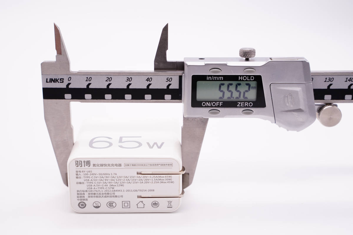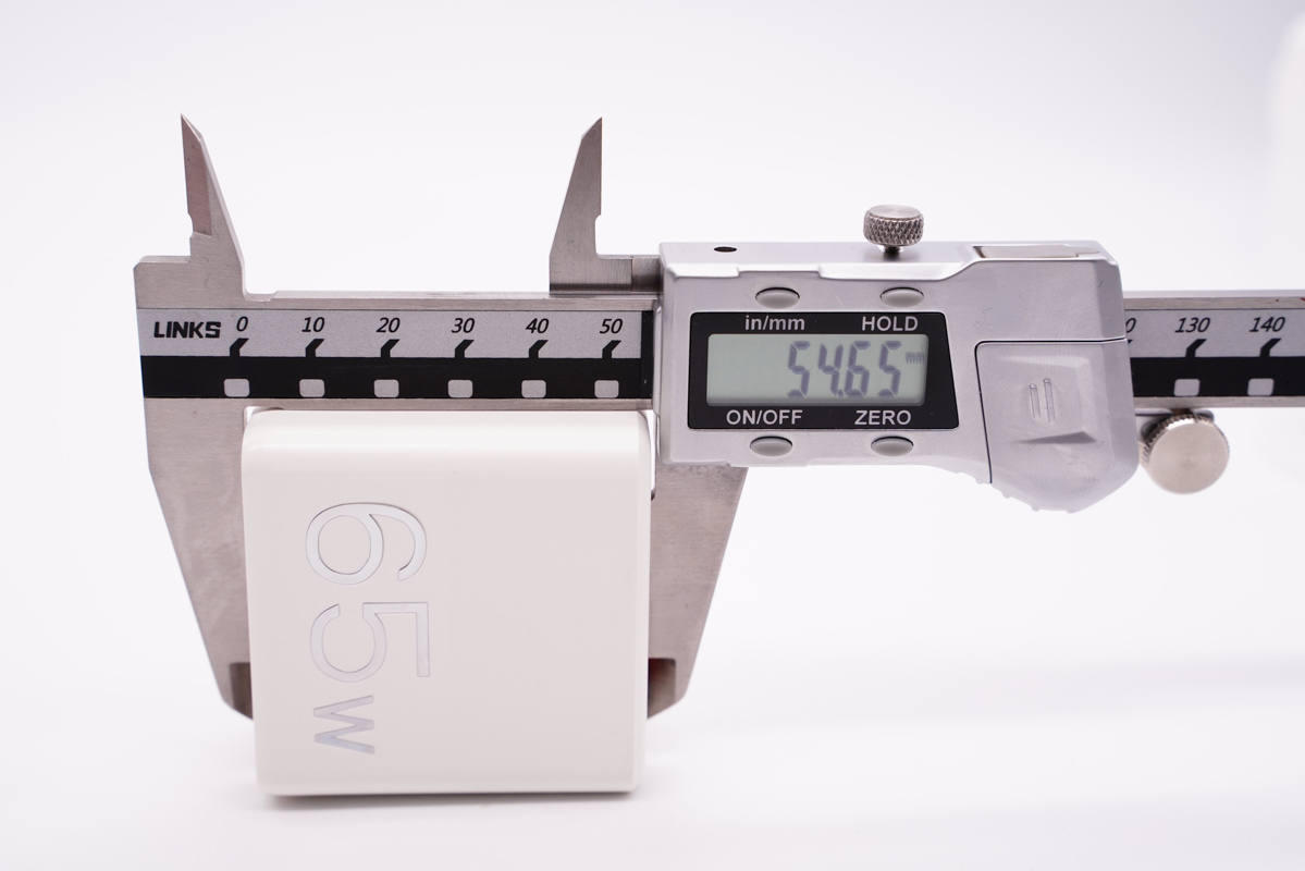 使用游標卡尺實測充電器機身高度為54.65mm。