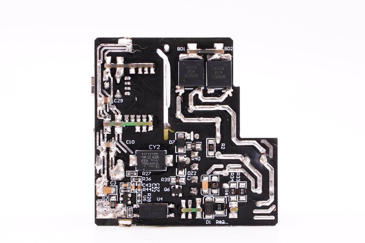 PCB板背面大電流走線加錫,可以看到有兩顆整流橋、貼片Y電容和光耦,初級次級分界明顯。