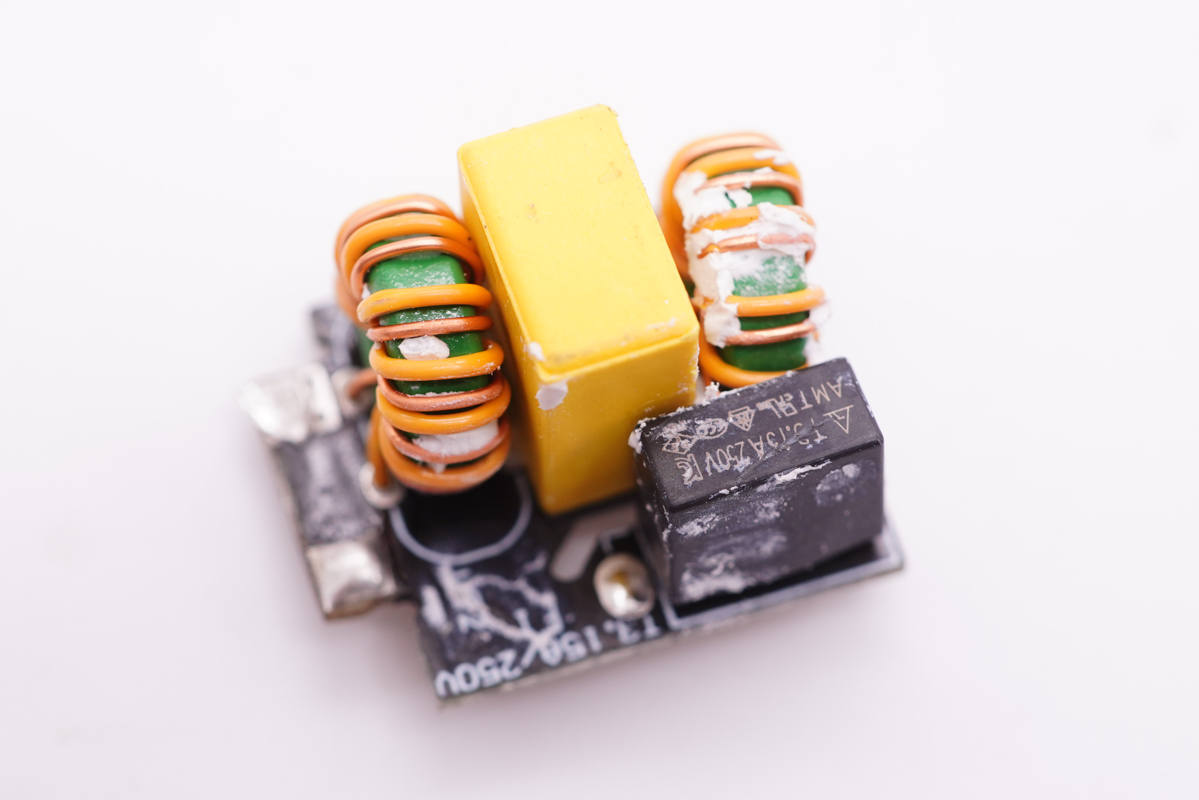 輸入端一覽,側面垂直焊接一塊小板,主板上設有五顆高壓濾波電解電容、工字電感和主控芯片供電電容。