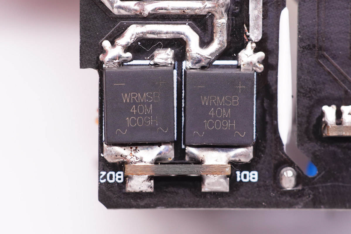 整流橋WRMSB40M來自深圳市沃爾德實業有限公司,設置兩顆是為了均攤發熱,降低溫升。這顆軟橋通過較軟的恢復曲線,比較平滑的關斷特性,可以降低二極管結電容達到非常少的諧波振蕩產生的效果。