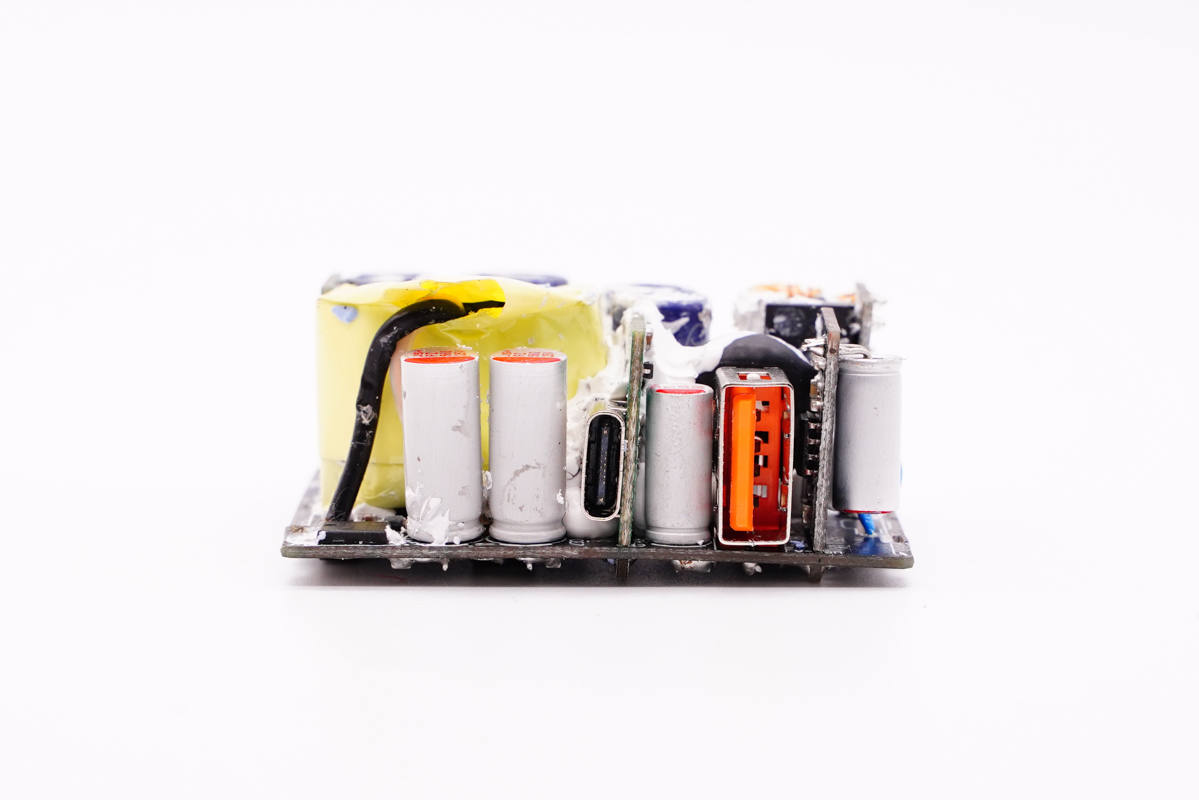 輸出端一覽,USB-C母座使用小板垂直焊接,USB母座直接焊接在主板上,兩個母座間有一顆固態電容,最右側還有一塊用于USB-A口的二次降壓小板。