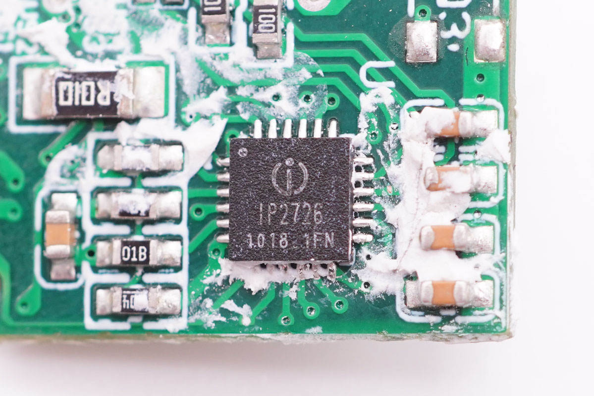 協議芯片采用英集芯IP2726,用于1A1C接口輸出電壓控制。這是一顆集成多種協議、用于USB輸出端口的快充IC,支持Type-C DFP、PD2.0/3.0、PPS、QC4+、QC2.0/3.0、FCP、AFC、SCP、MTK PE+、Apple2.4A、BC1.2以及三星2A等協議。具有高集成度和豐富的功能,在應用時僅需極少的外圍器件,有效減小整體方案的尺寸,降低BOM成本。