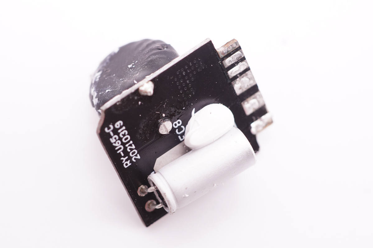 主板另一側垂直焊接一塊小板,此外還有變壓器和兩顆固態電容,變壓器輸出側設有同步整流控制器和整流管。