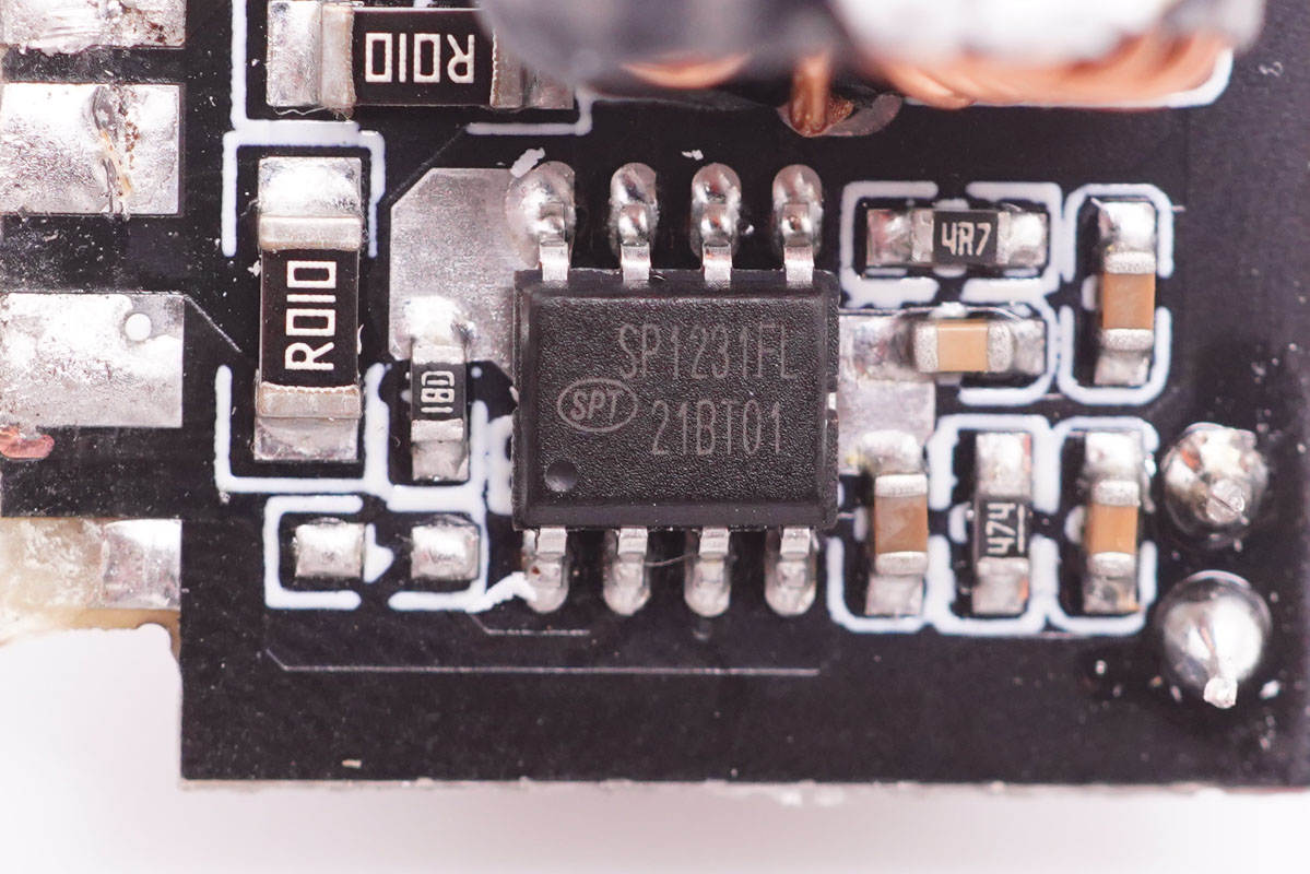 同步降壓轉換器采用硅動力SP1231FL,當雙口同時輸出時,進行二次降壓使USB-A口以5V恒壓輸出。SP1231FL是國內首款超低待機功耗,66mV Sense 基準,相比同類產品5V輸入更小壓差。工作電壓范圍5到30V,100%占空比,頻率可調,可以做到小體積設計,是目前多口PD快充產品USB-A口應用的高性價比選擇。