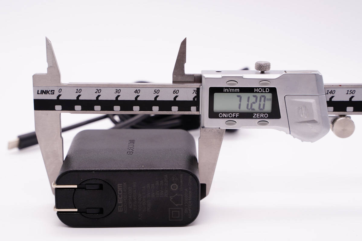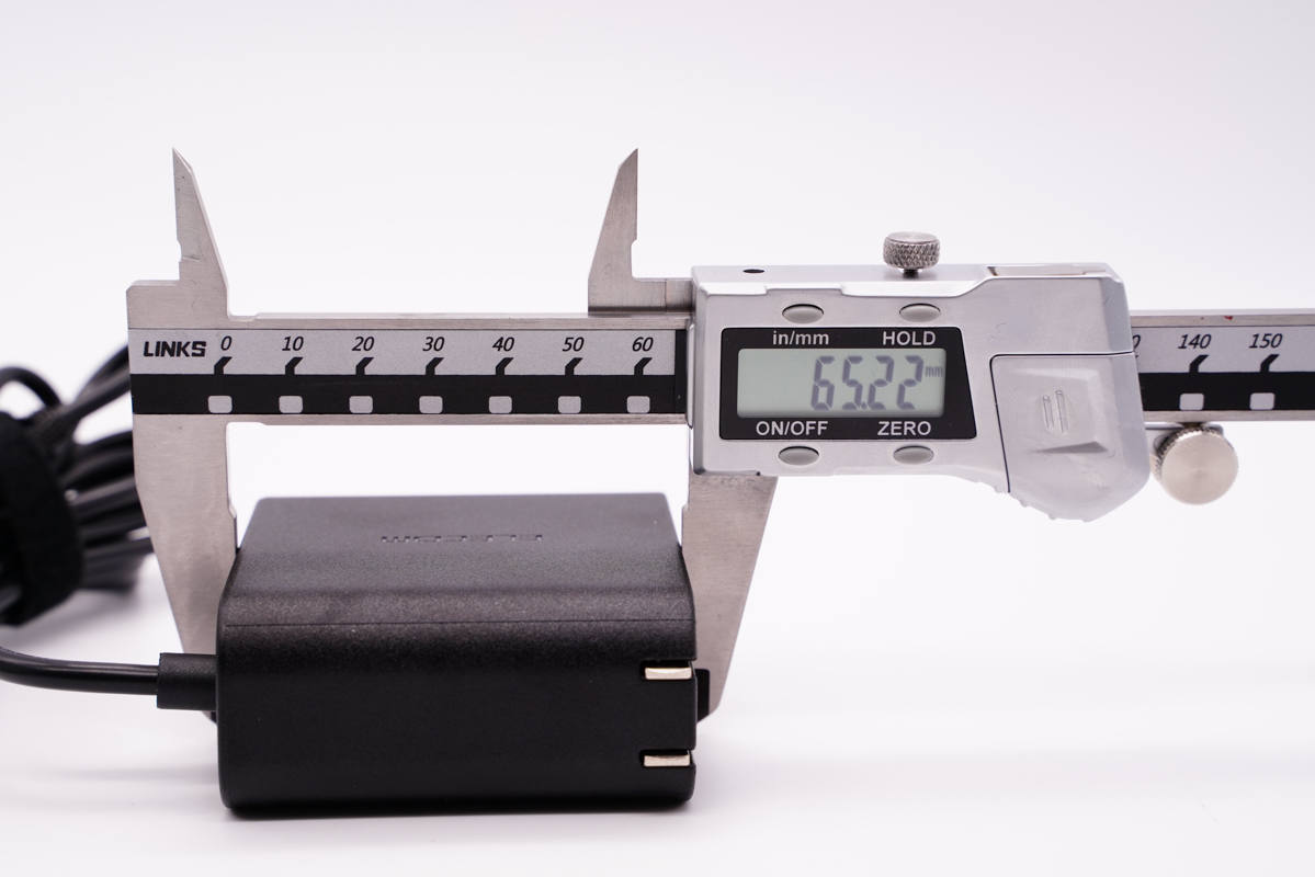 使用游標卡尺實測充電器機身長度為65.22mm。