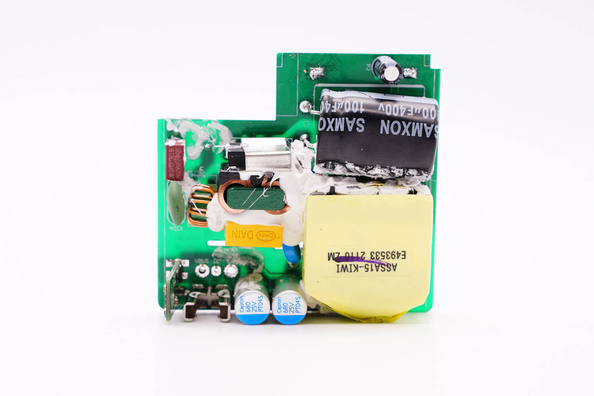 充電頭網通過拆解了解到,充電器開關電源采用必易微KP2201SGA+KP4050LGA高性能快充方案,搭配的分別是東微高壓MOS管以及真茂佳同步整流管,輸出寬范圍電壓,由智融SW2303協議芯片控制輸出電壓。得益于必易微這套快充方案的使用,充電器主板背面外圍器件很少,看上去非常簡潔。無論是對產品設計、生產,還是成本方面,都非常有幫助。
