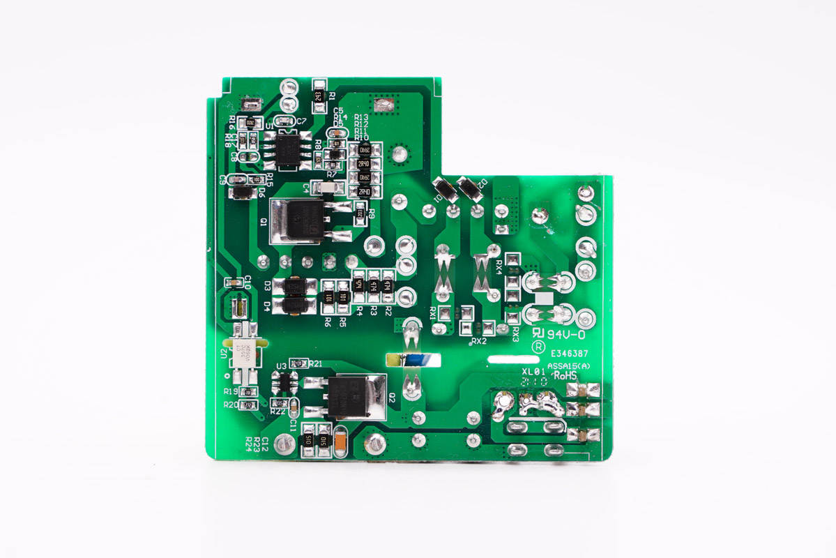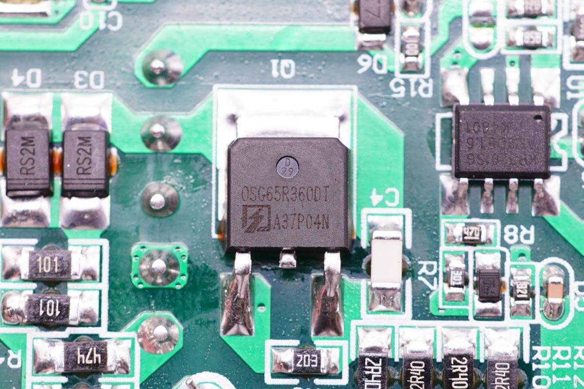 PCB板背面一覽,白色光耦橫跨在初級次級之間,初級側設有PWM主控芯片和初級開關MOS管,次級側設有同步整流控制器和整流管。