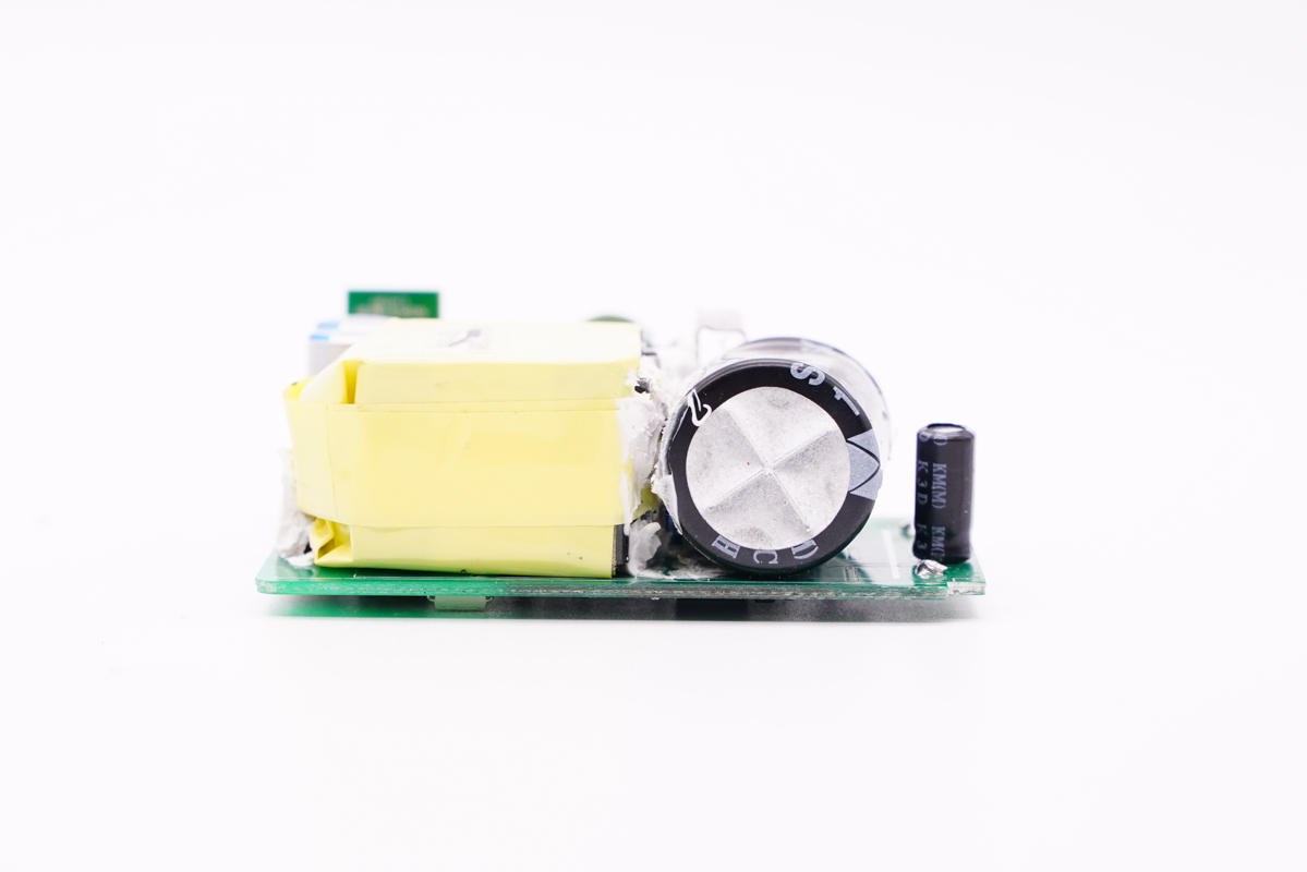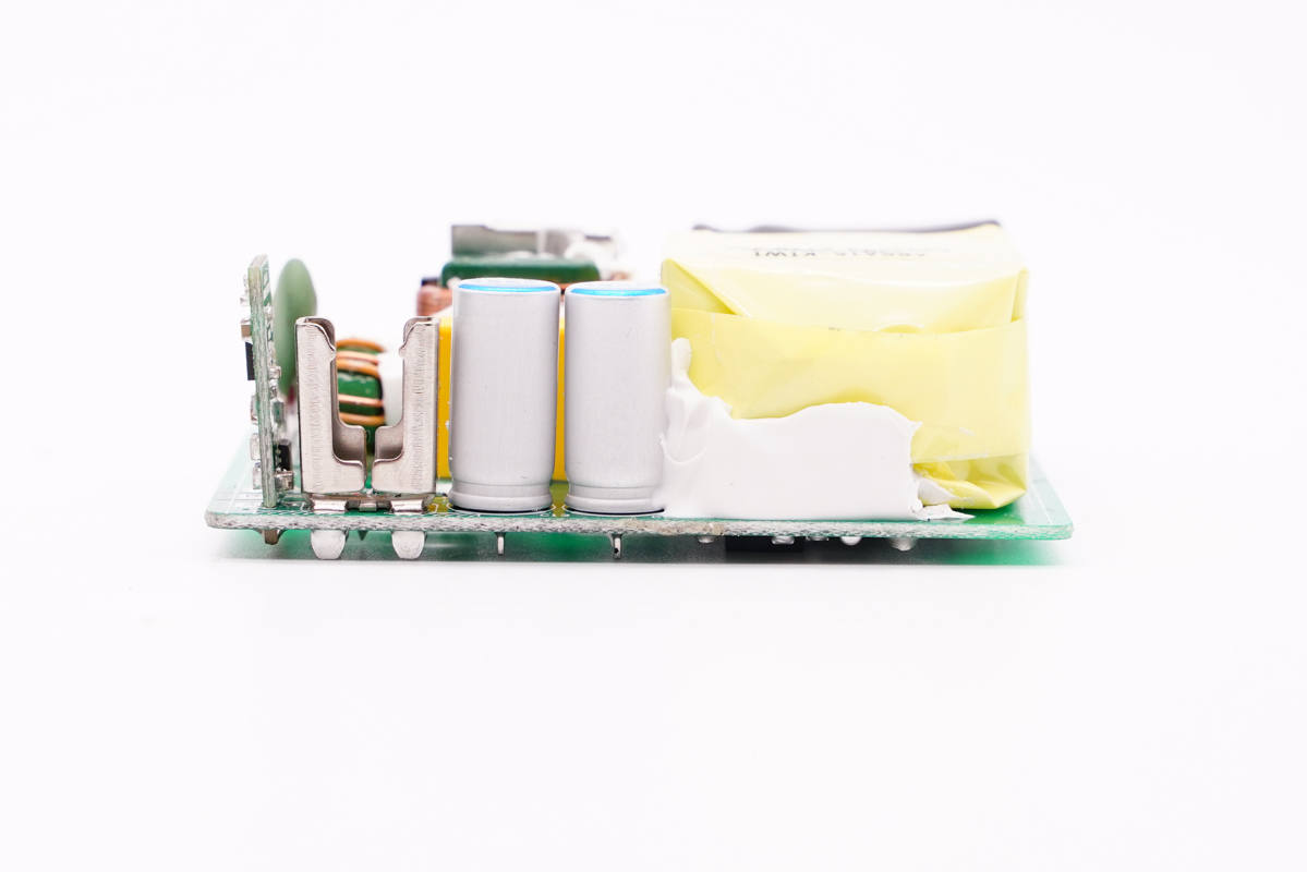 PCB板側面一覽,電容兩側分別是小電容和變壓器。