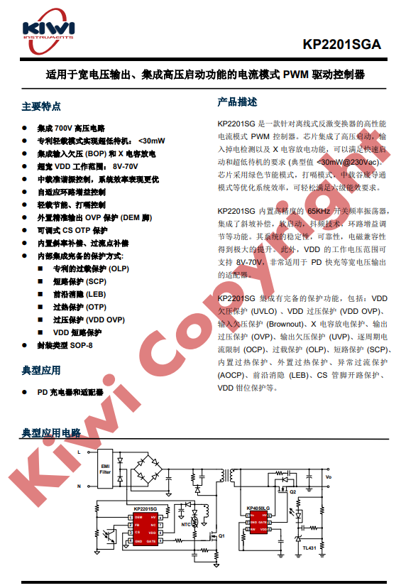 KP2201SGA 內置高精度的 65kHz 開關頻率振蕩器,集成了斜坡補償,軟啟動,抖頻技術,環路增益調節等功能。其系統的穩定性,可靠性,電磁兼容性得到極大的提升。此外,VDD 的可工作電壓范圍為 8V-70V,VDD 極限耐壓為 80V,非常適用于 PD 快充等寬電壓輸出的適配器。
