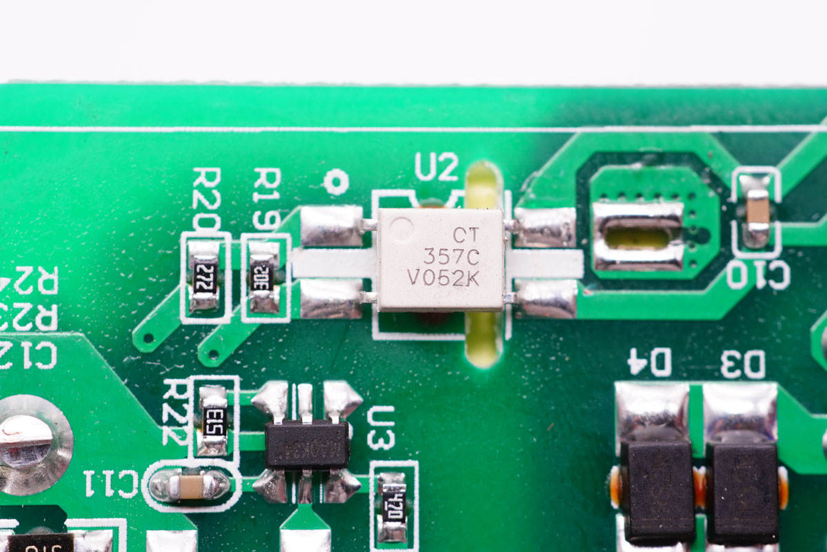 CT 357C,用于初級次級通信,反饋調節輸出電壓。光耦下方開有隔離槽絕緣。