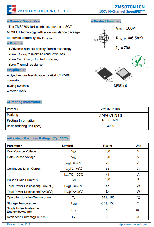 同步整流管采用真茂佳ZMS070N10N,耐壓100V,導阻6.5mΩ,DFN5x6封裝。