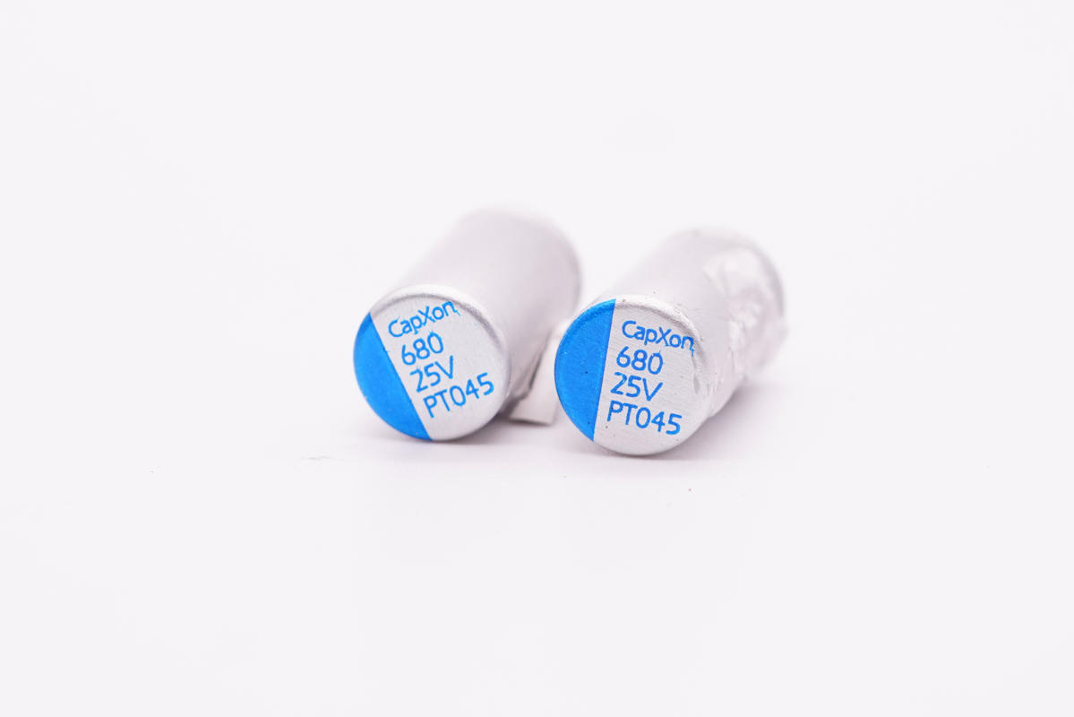 兩顆輸出濾波固態電容來自豐賓,規格都是25V 680μF。PT系列固態導電聚合物電容,125℃ 2000小時可靠性保證。