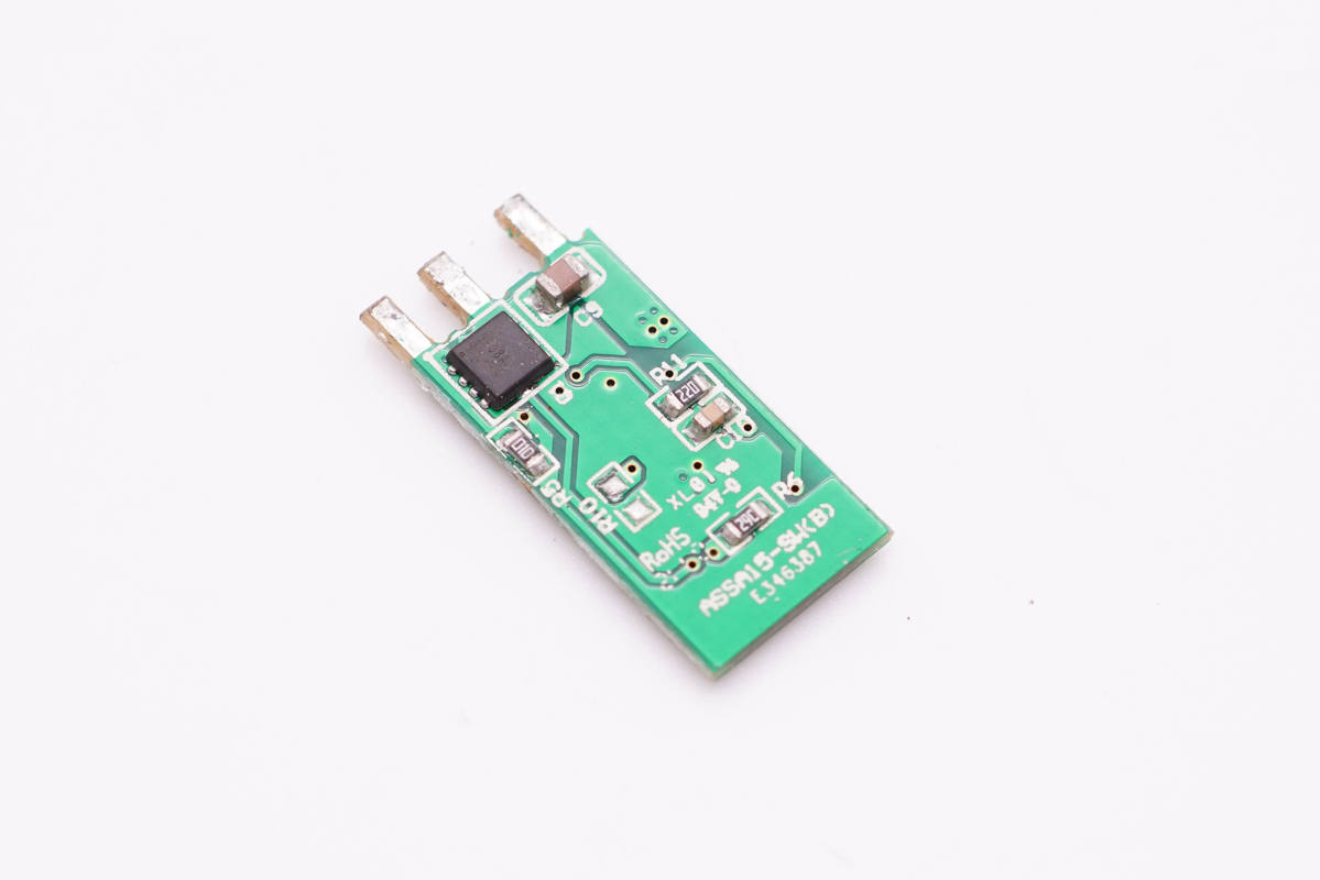 輸出端一覽,左側垂直焊接協議小板,右側設有兩顆固定電容。