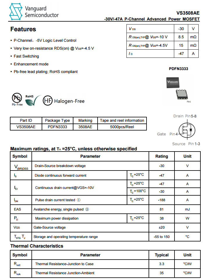 輸出VBUS開關管采用威兆VS3508AE,PMOS,耐壓30V,PDFN3333封裝。