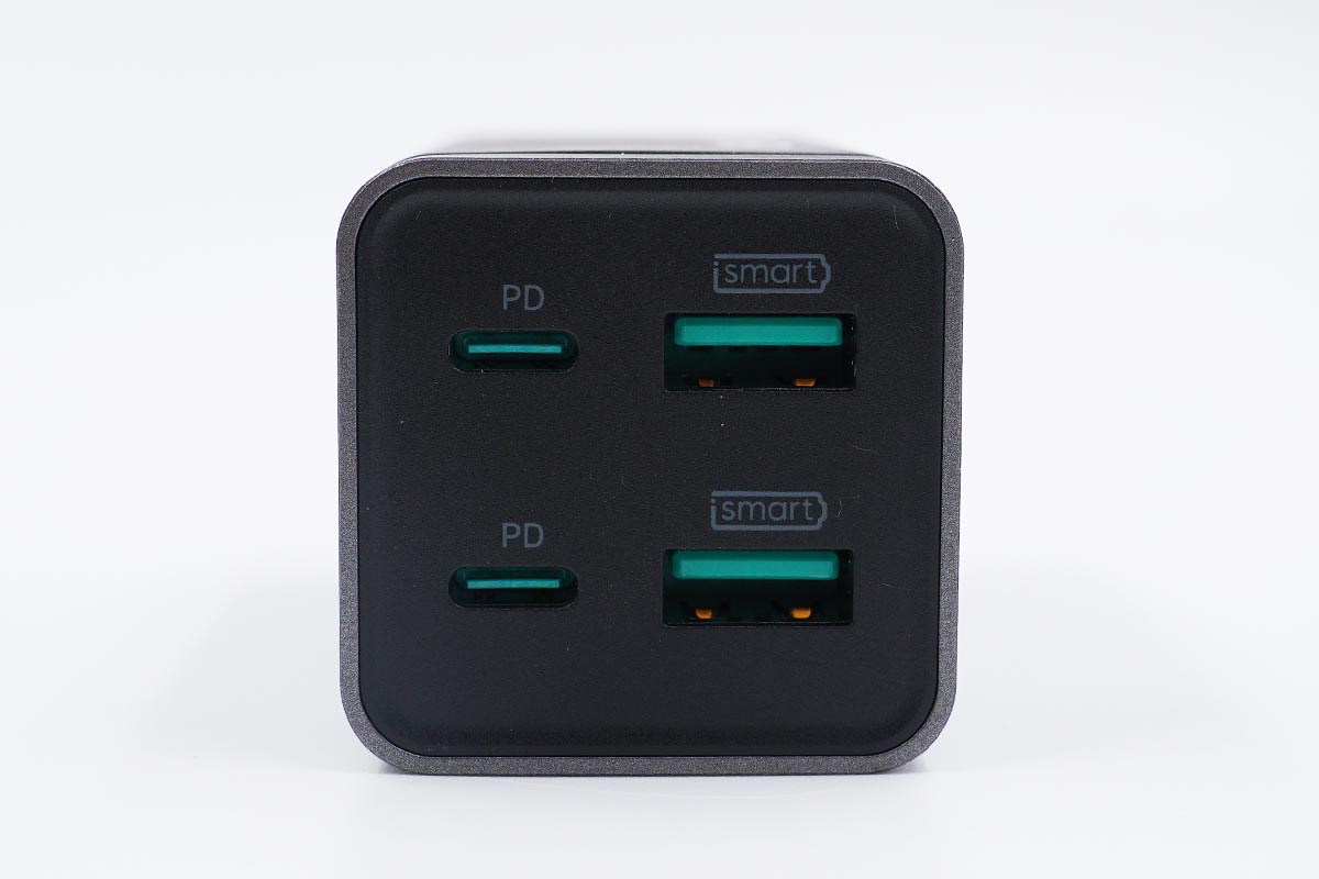 輸出頂面2A2C四個接口均為綠色膠芯,兩個A口均支持18W快充,兩個C口均支持65W快充,均可盲插使用。
