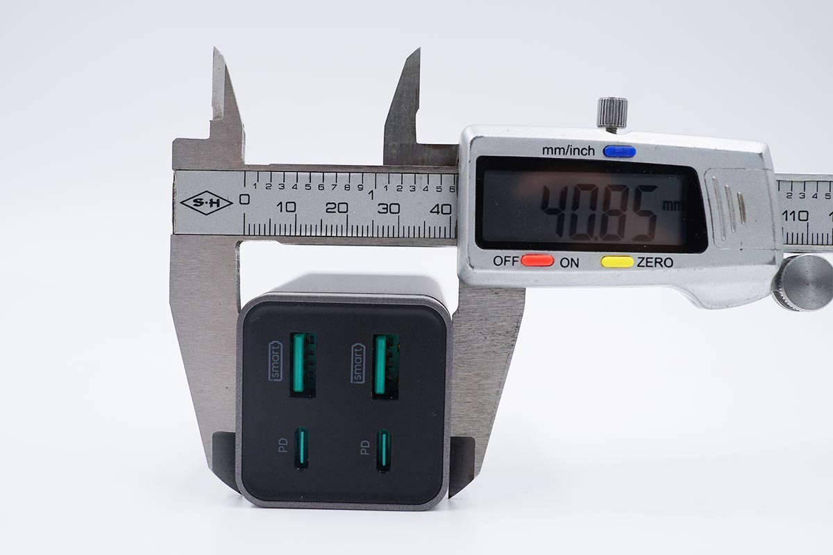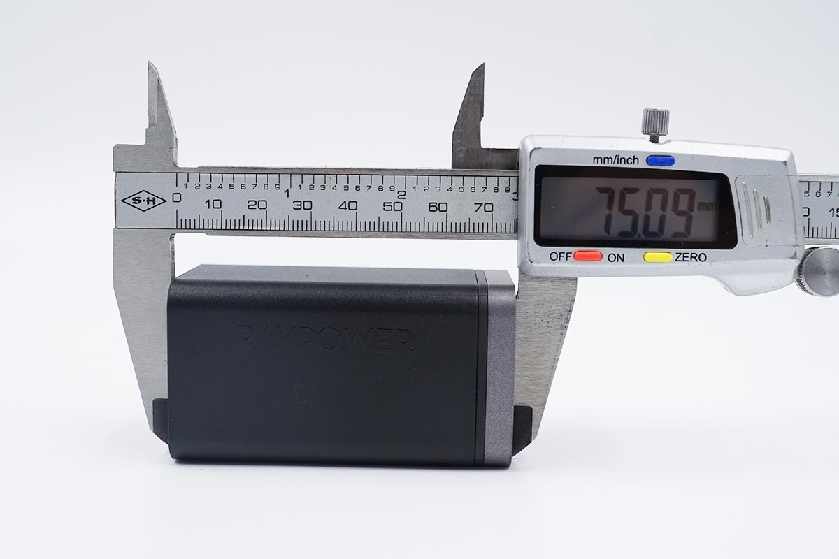 使用游標卡尺實測充電器機身長度為75.09mm。