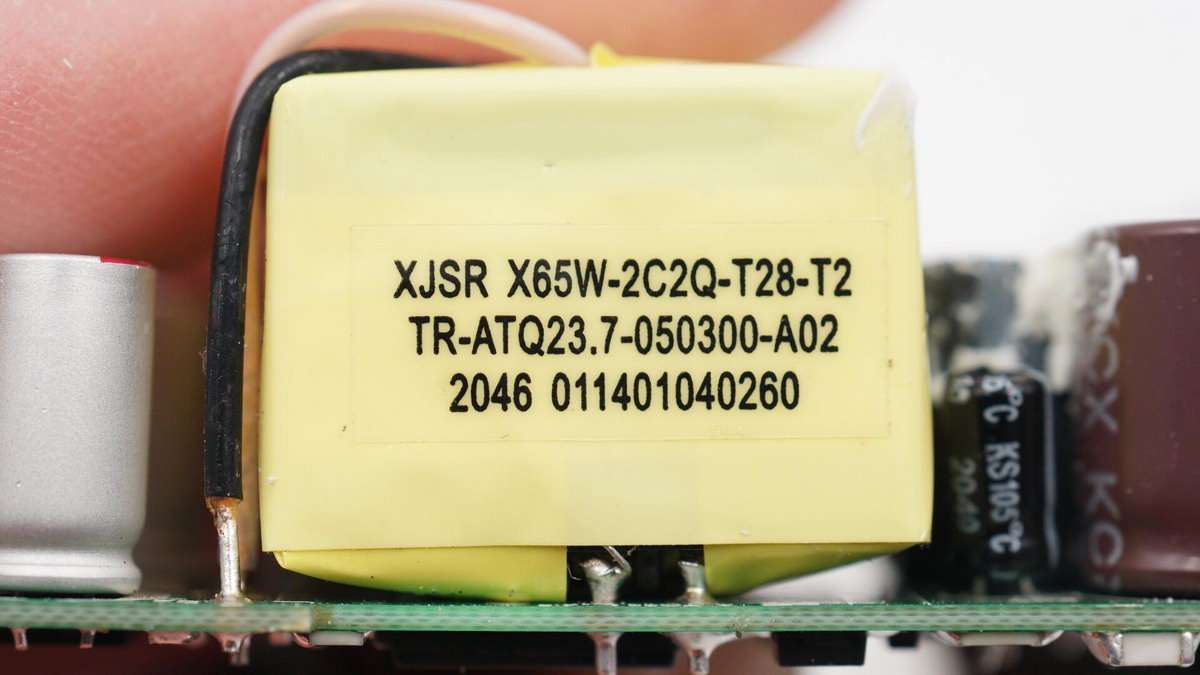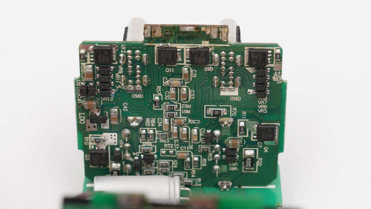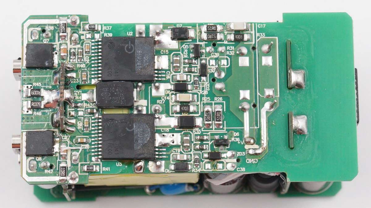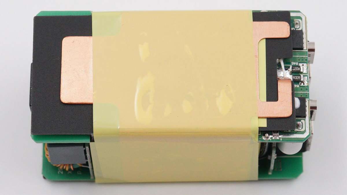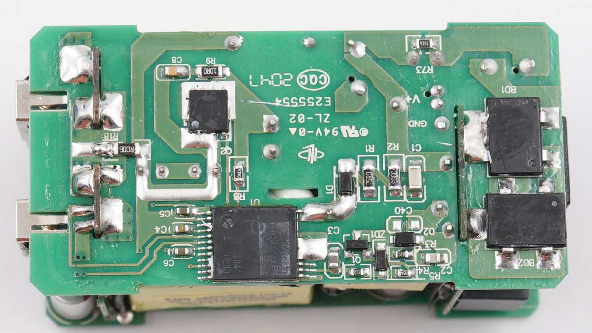 另一塊長方形電路板上設有一顆PI主控芯片和同步整流管。因此這款充電器總共設有三路開關電源電路,兩個USB-C口各一路,兩個USB-A口共用一路。