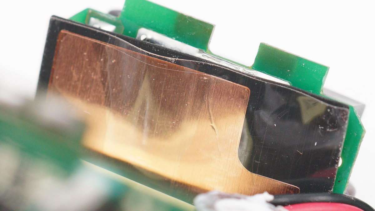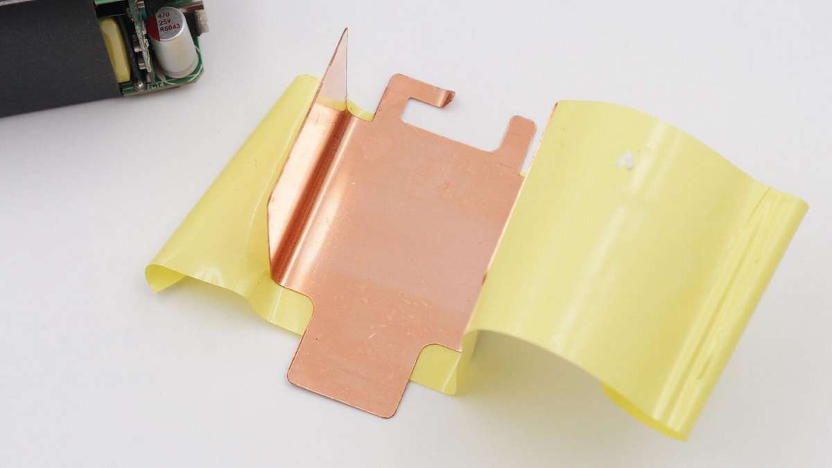 充電器模塊覆蓋U型銅片幫助散熱,同時粘貼膠帶和焊接固定,另外設有塑料板進行隔離。