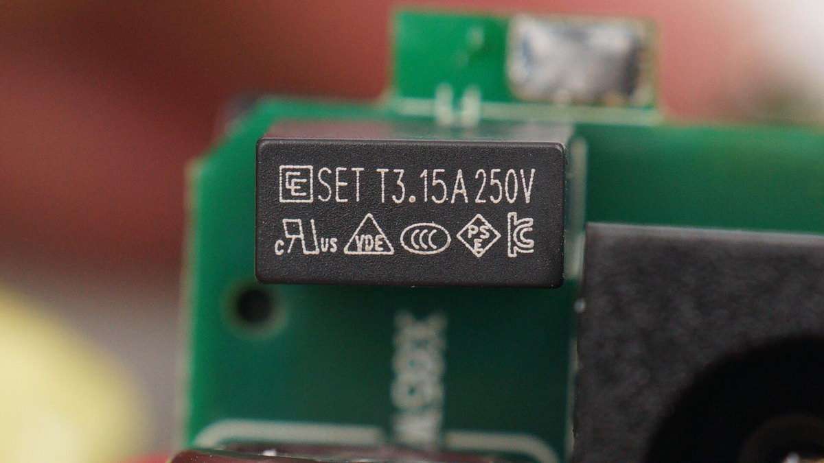 延時保險絲特寫,規格為3.15A 250V。