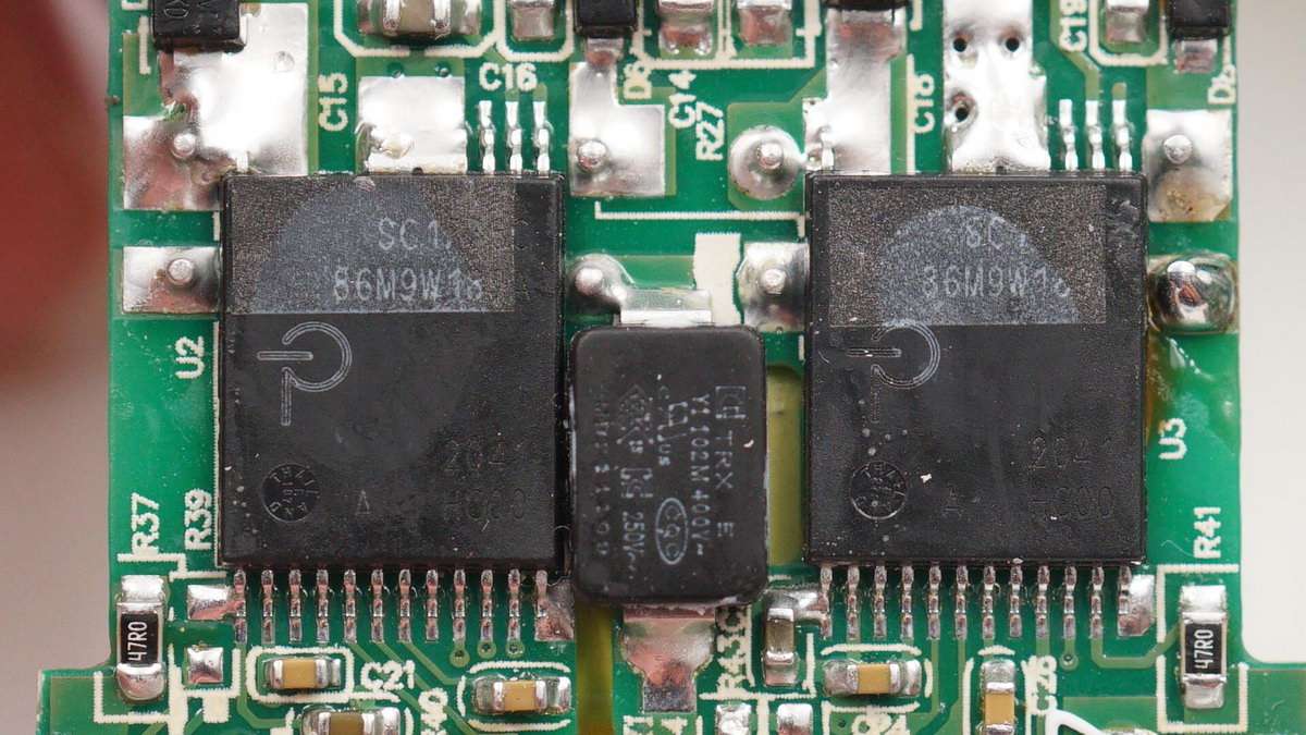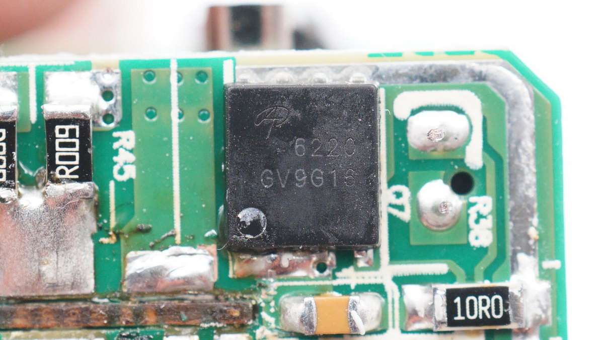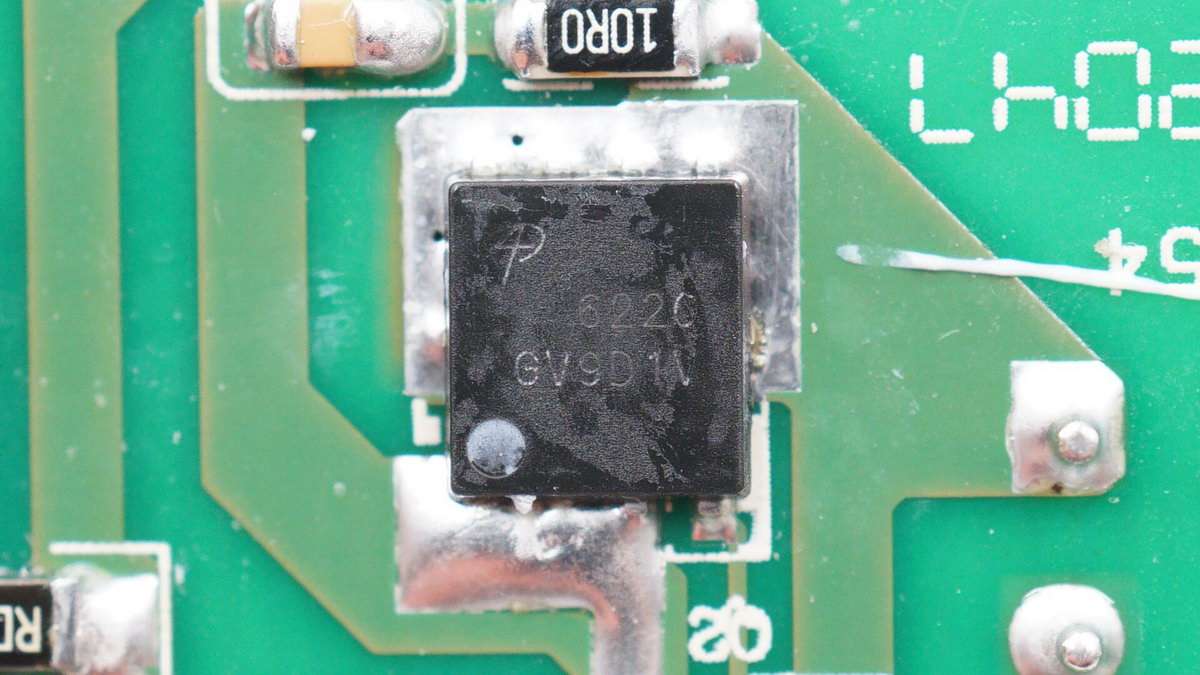 輸出端小板背面設有四顆相同的MOS管,用于兩路輸出并聯實現單口65W輸出或單口獨立輸出,下方MOS管和取樣電阻用于USB-A口輸出。