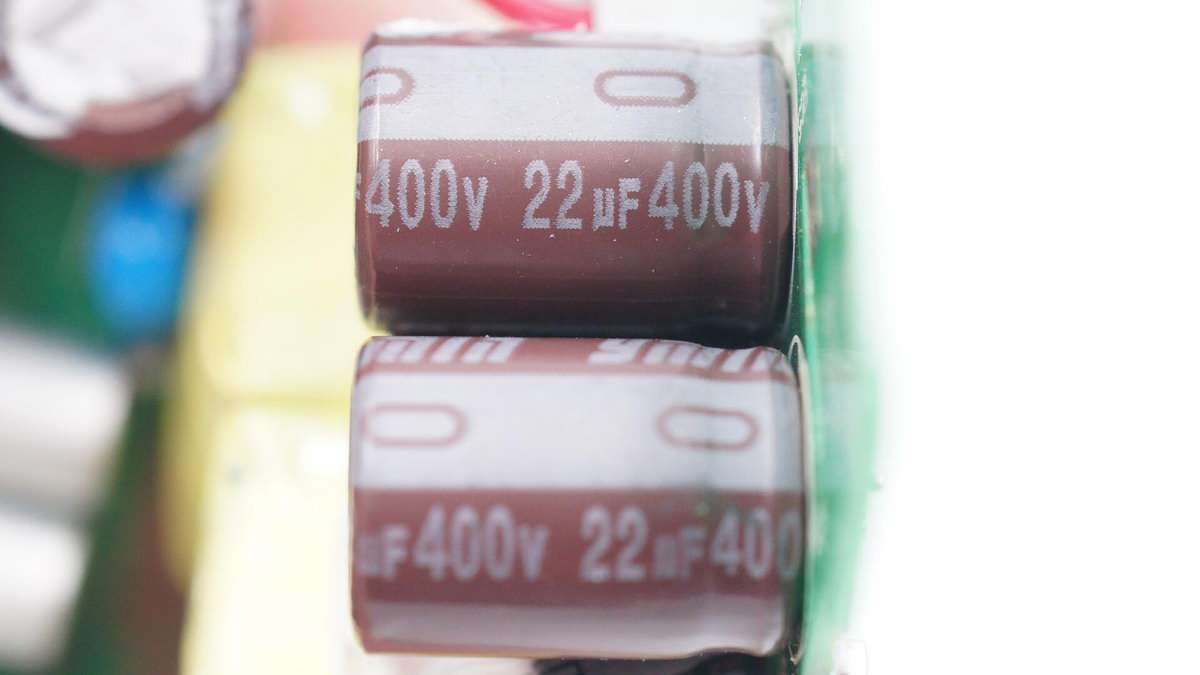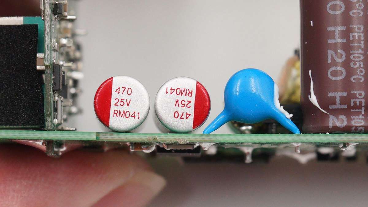 另外兩個USB-C口電路的高壓濾波電解電容也是來自永銘,規格均為400V 22μF。