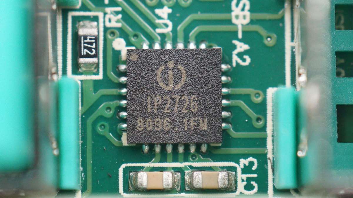 正面三顆協議芯片均為英集芯IP2726,左中兩顆用于兩個USB-C口協議識別,右側一顆用于兩個A口的協議識別。