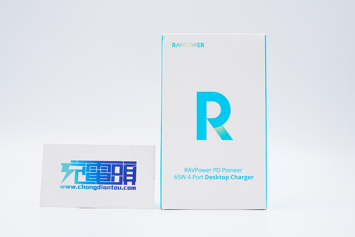 包裝盒采用藍白配色,印有RAVPOWER品牌和充電器名稱,中間是大大的R藝術字。