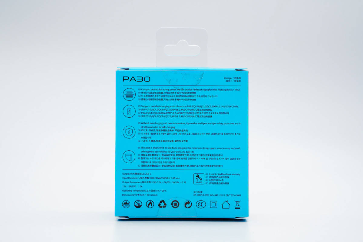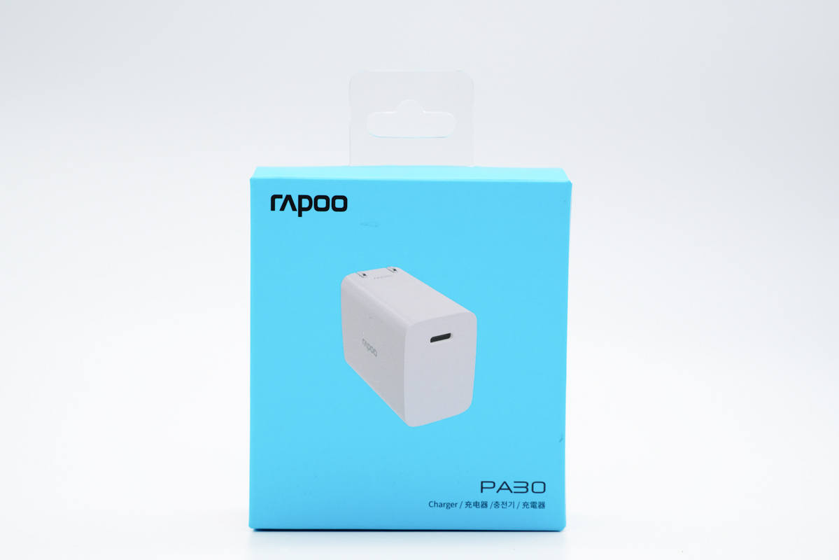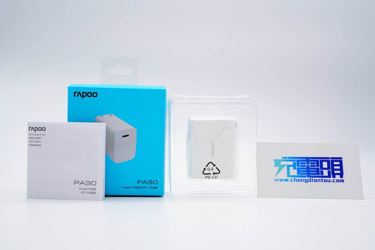 包裝盒為藍色配色,正面印有Rapoo品牌、充電器外觀圖、PA30型號等。
