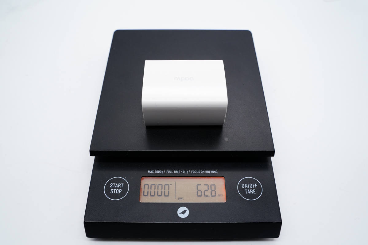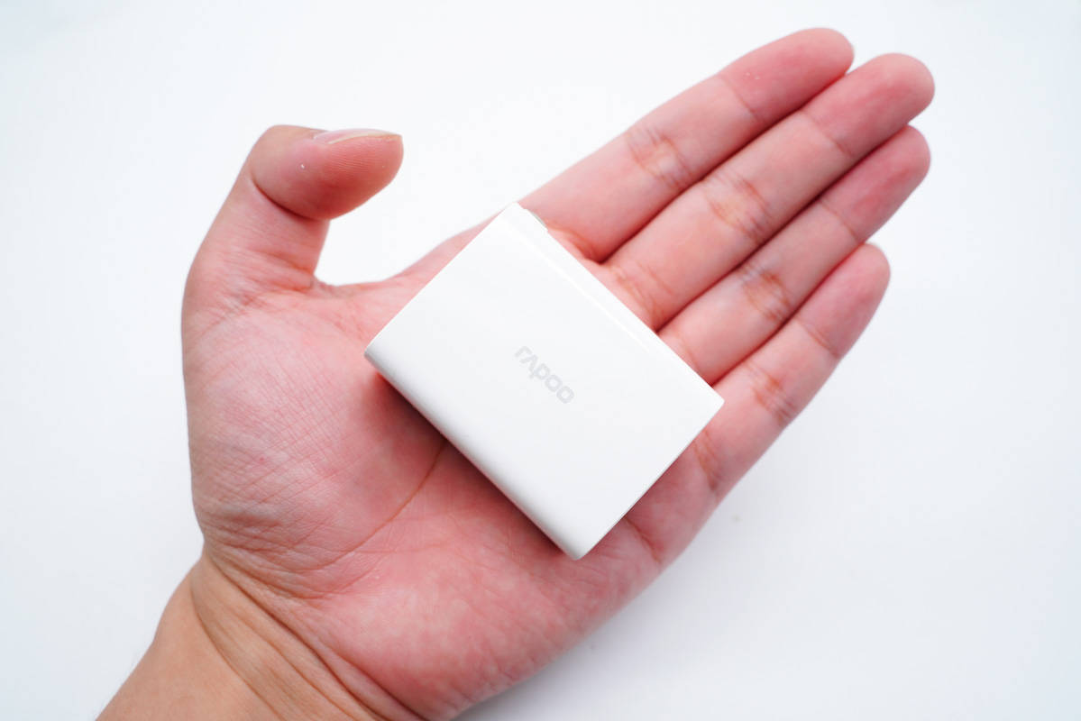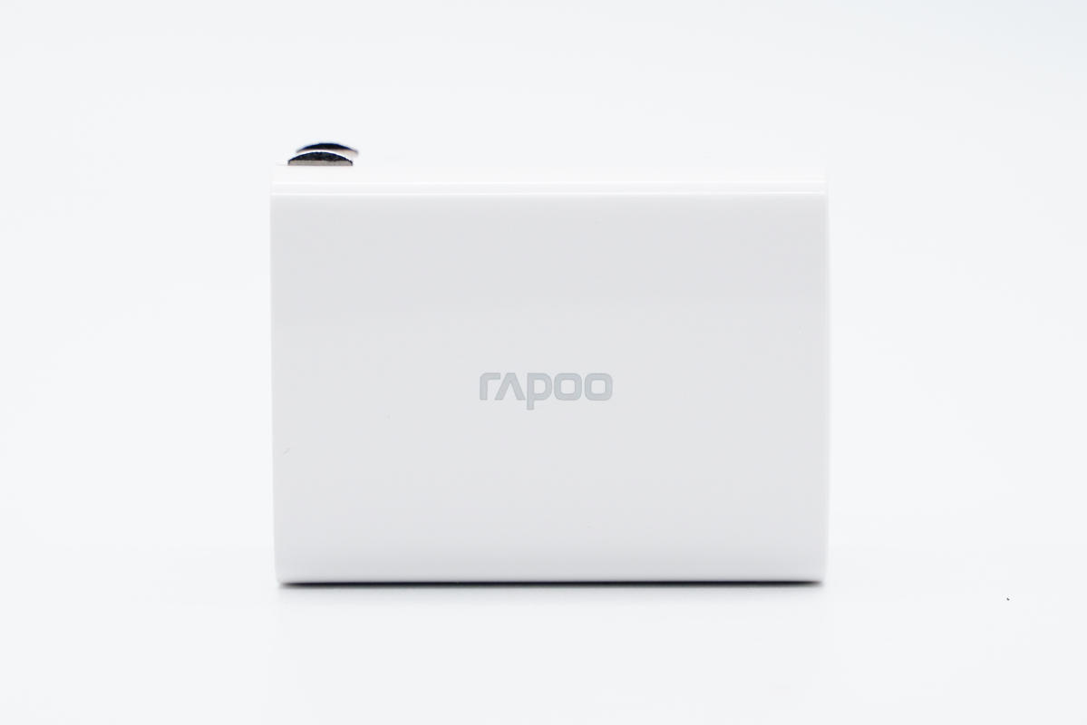 充電頭采用直板造型設計,腰身鋼琴烤漆工藝處理,各面之間過渡圓潤,正面印有Rapoo品牌。