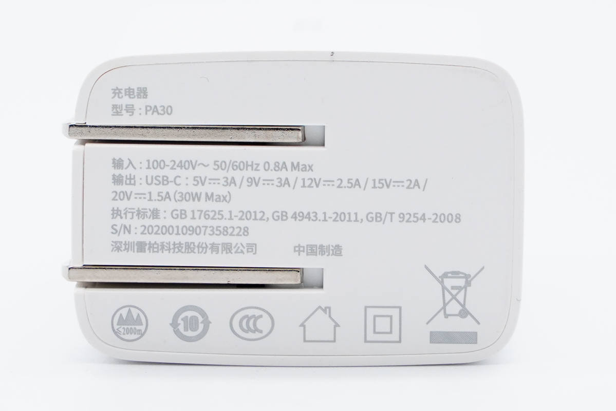 雷柏這款30W PD快充充電器機身光滑簡潔,造型經典。配備可折疊插腳方降低用戶出差攜帶成本,配備單USB-C接口,支持多個主流快充協議,具備5V3A、9V3A、12V2.5A、15V2A、20V1.5A齊全電壓檔位以及3.3-12V2.5A和3.3-20V1.5A兩組PPS電壓檔位,整體兼容性不錯,滿足大多數中小設備快充需求。