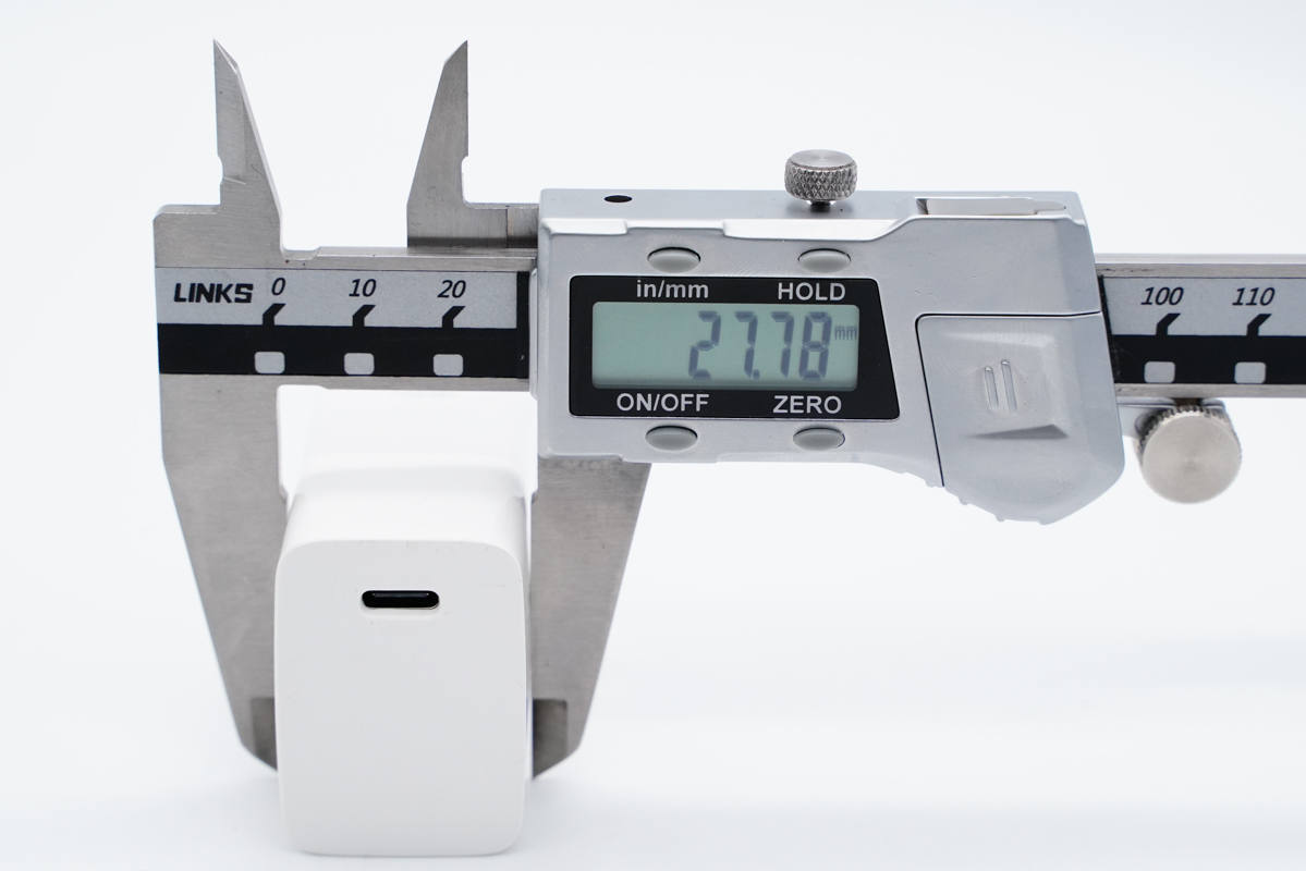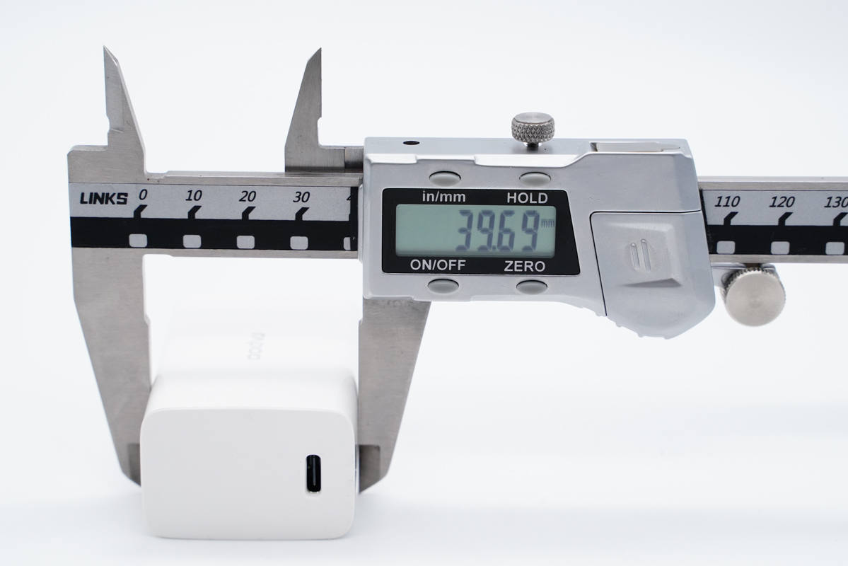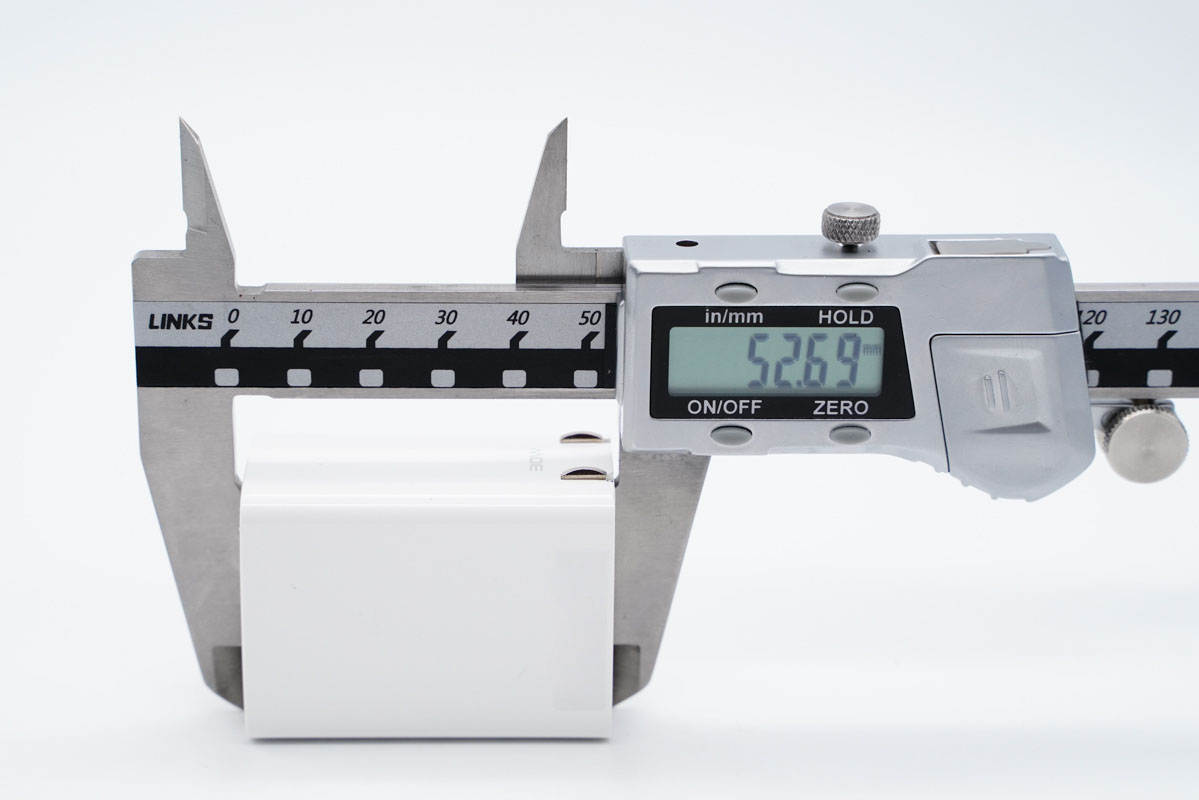 使用游標卡尺實測充電器機身長度為52.69mm。