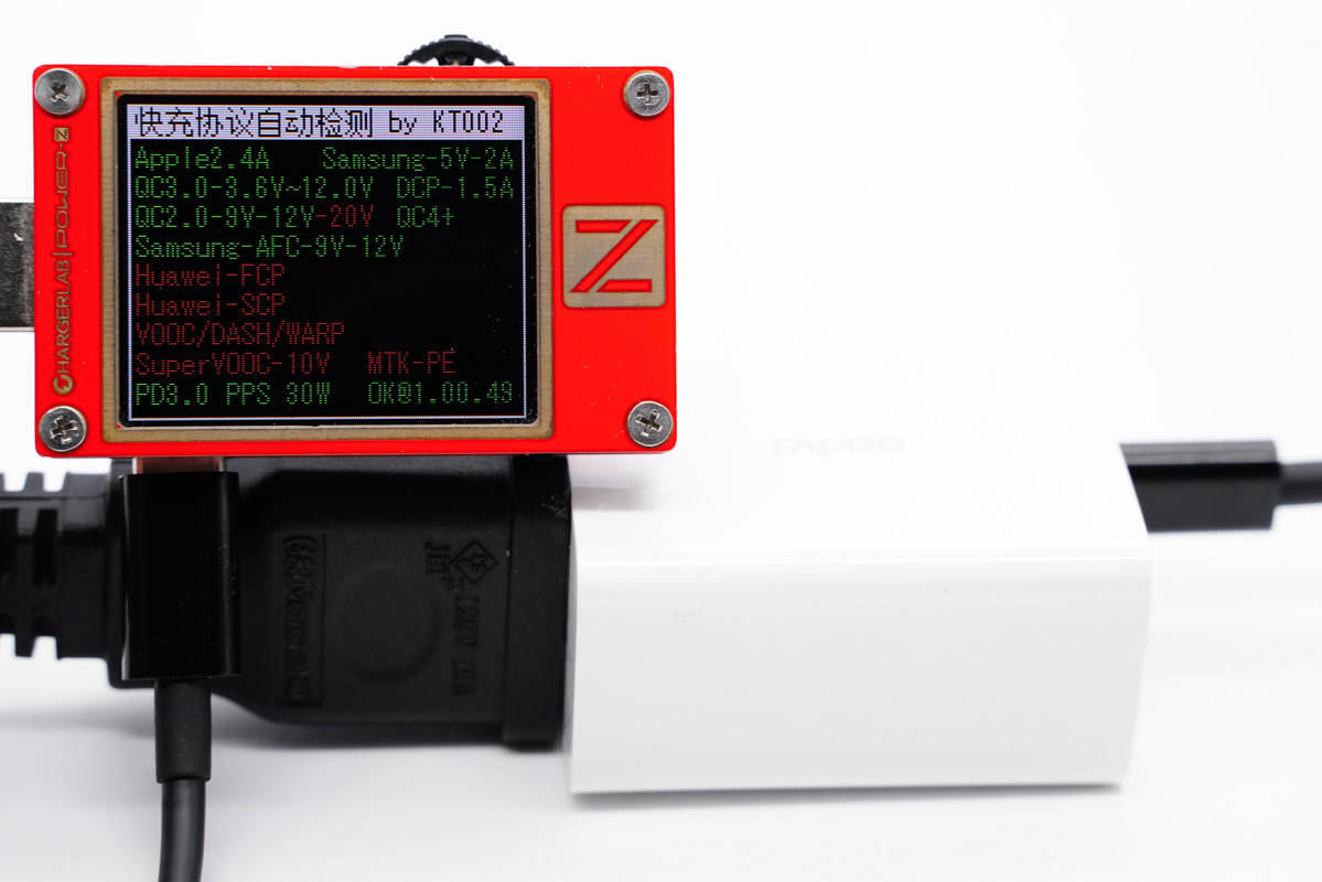 使用ChargerLAB POWER-Z KT002測得USB-C口支持Apple 2.4A、Samsung 5V2A、DCP協議,以及QC2.0/3.0、AFC、PD3.0、PPS快充協議。