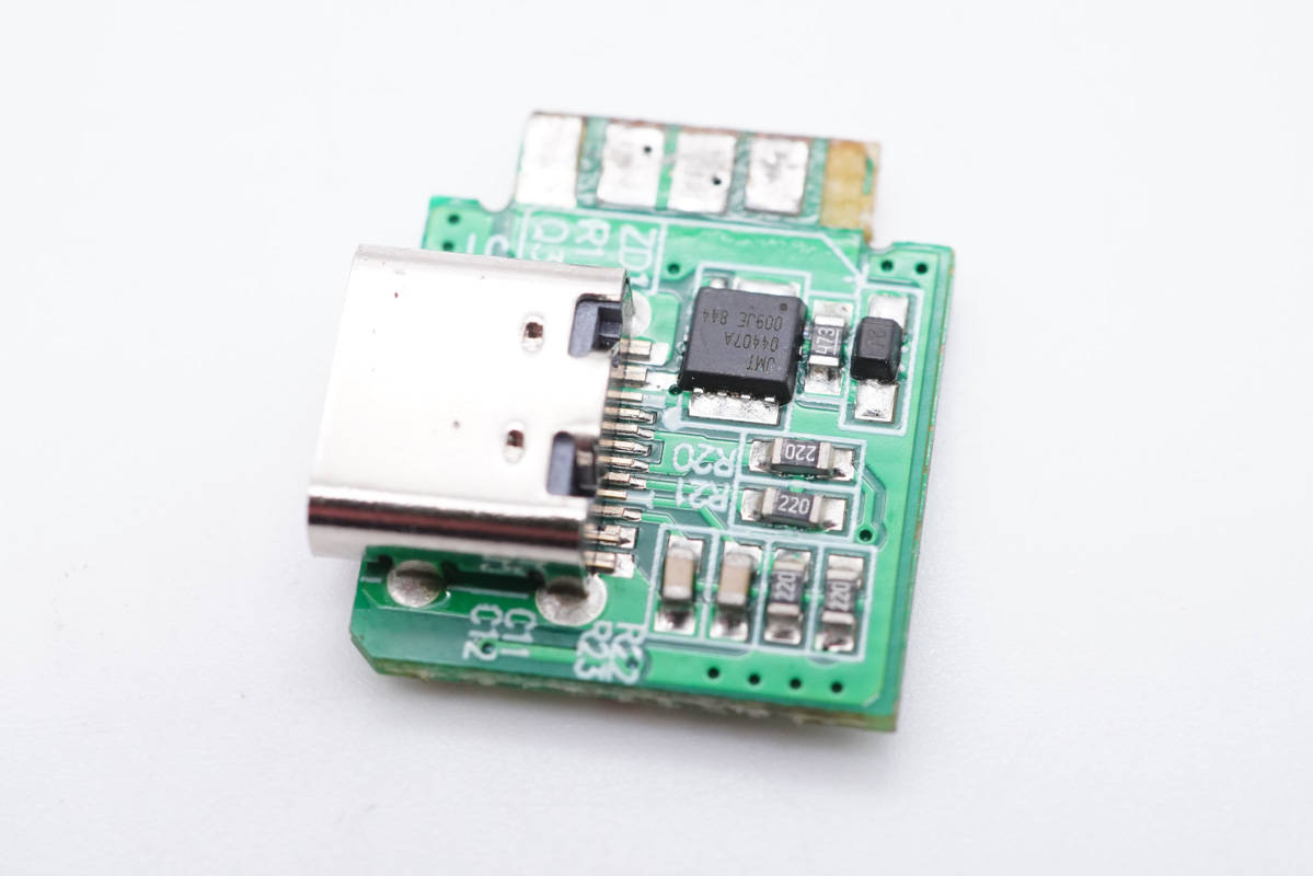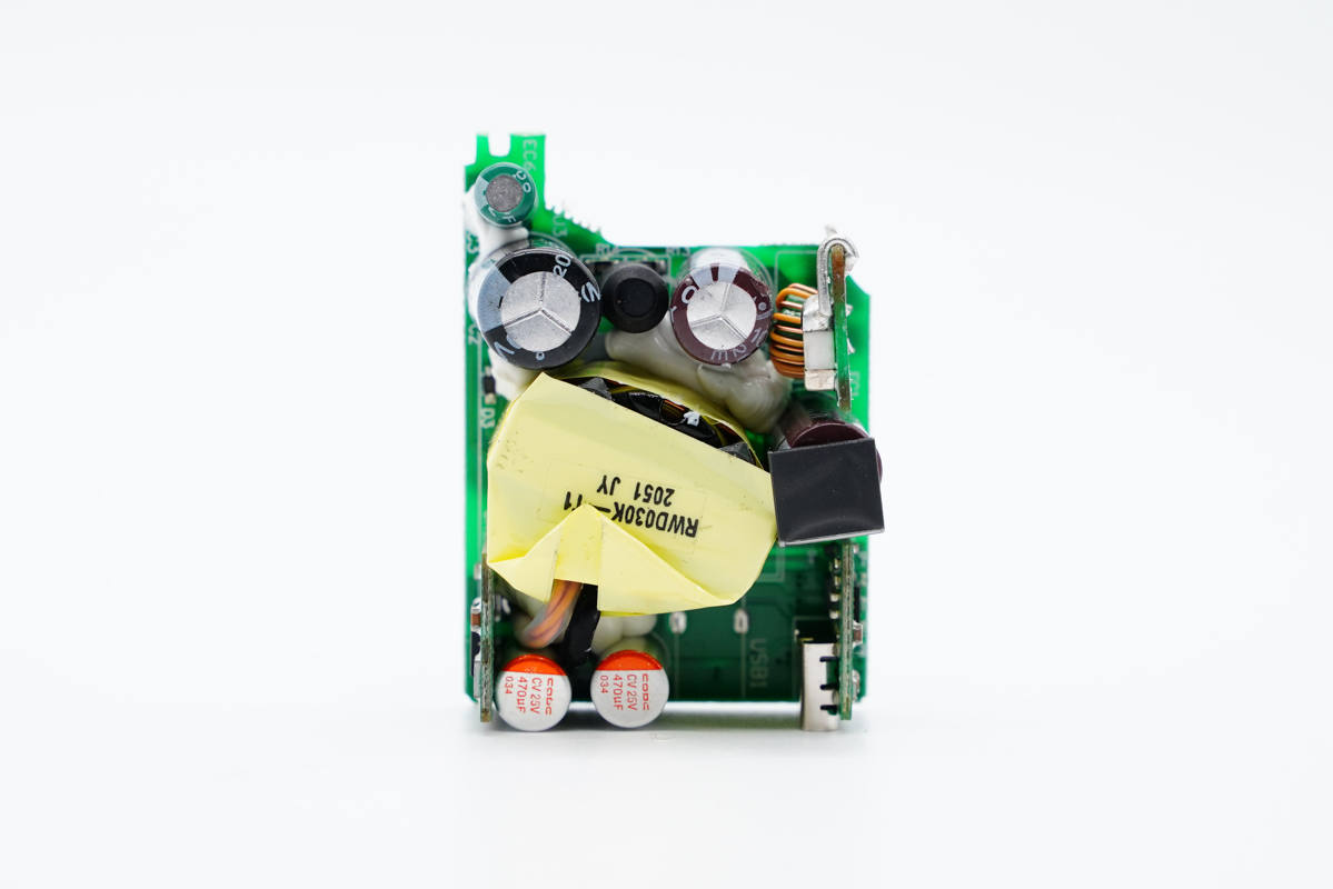 輸出端一覽,同步整流小板右邊是兩顆濾波固態電容,USB-C母座使用協議小板垂直焊接。