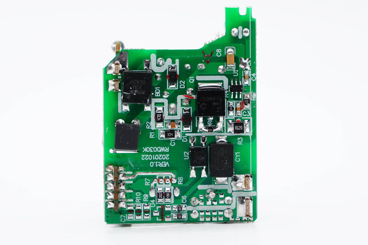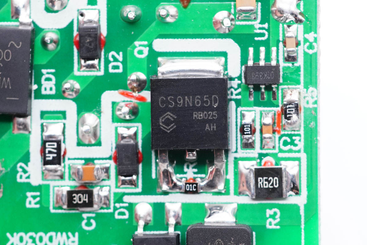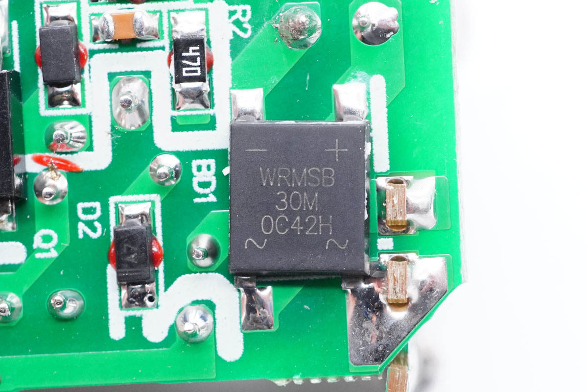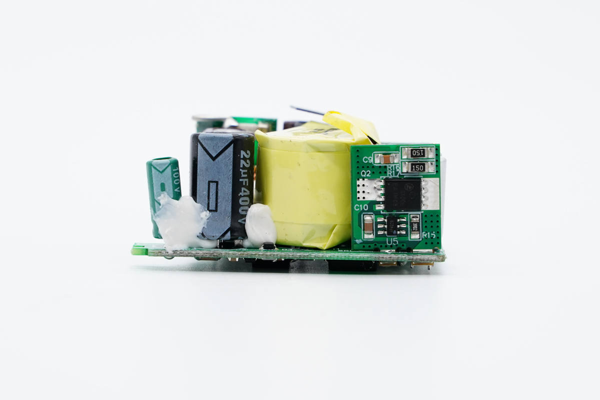PCB板背面一覽,設有整流橋、PWM主控芯片、初級開關MOS管、光耦和貼片Y電容。