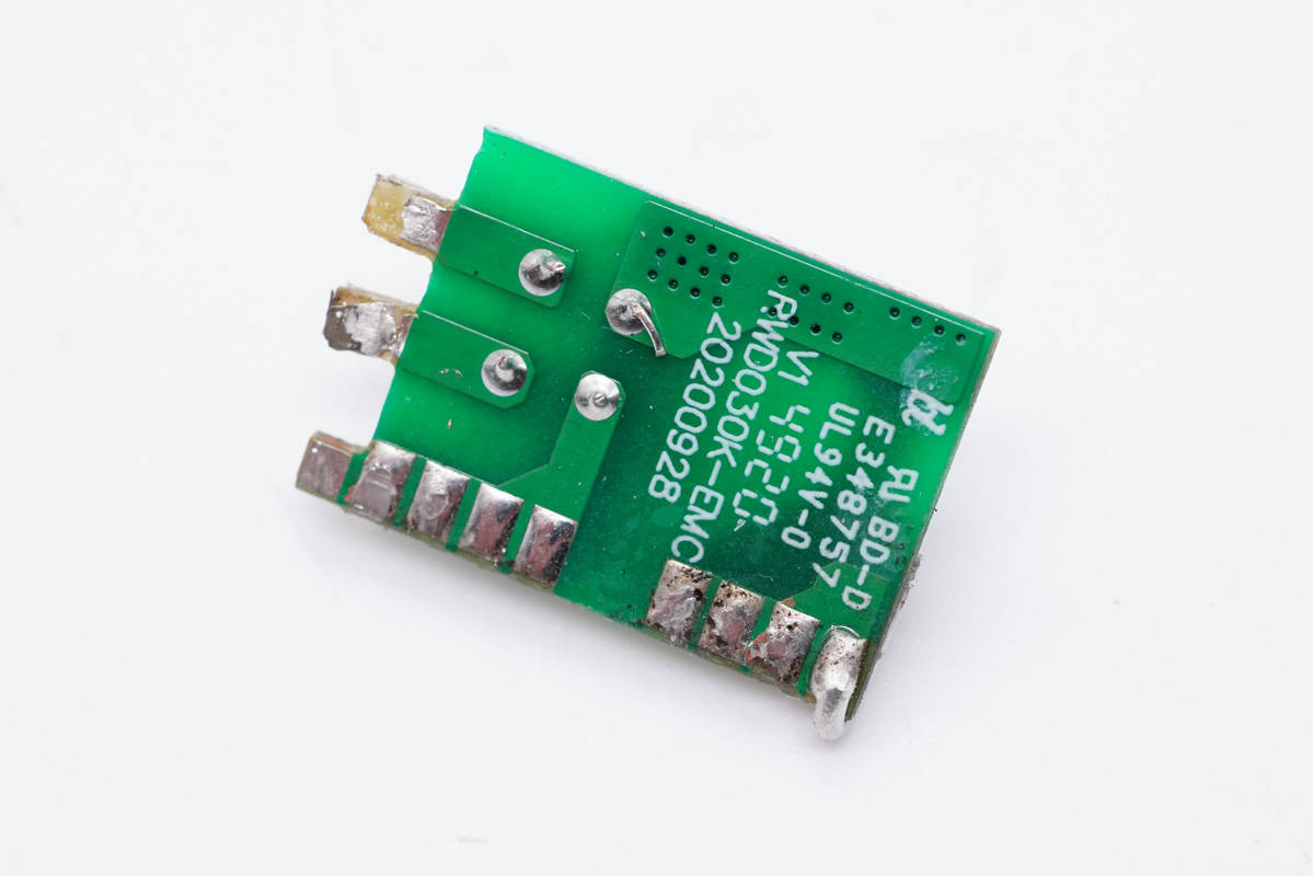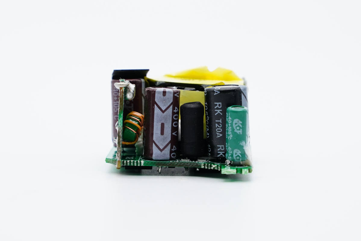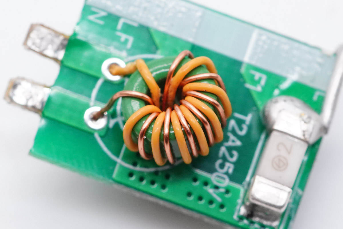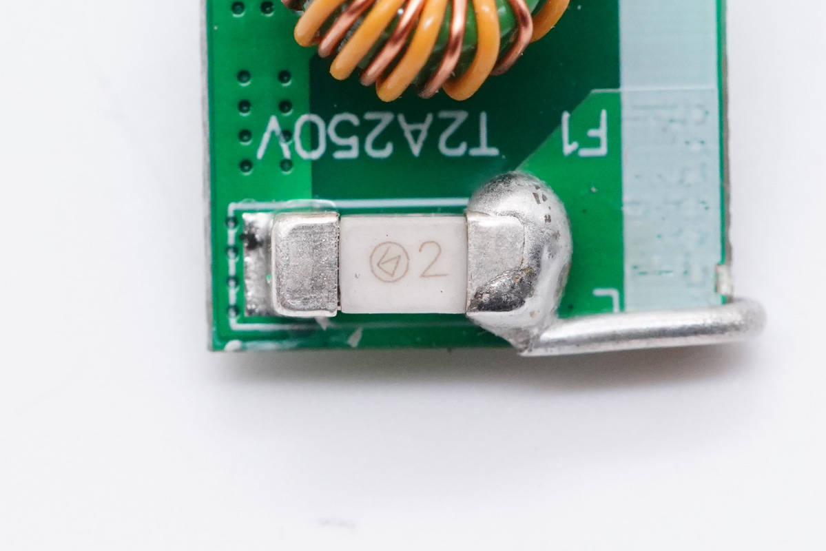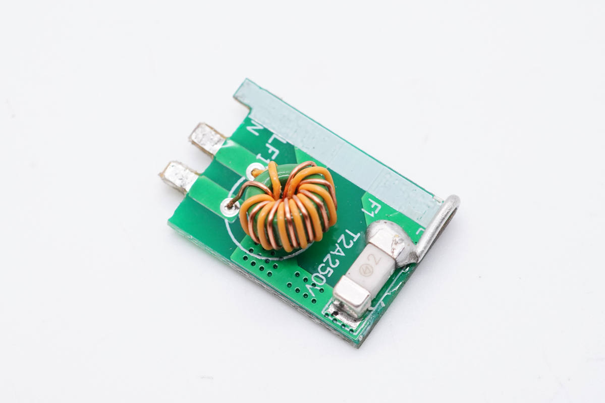 輸入端一覽,左側設有小板,主板上設有高壓濾波電解電容、工字電感和主控芯片供電電容。