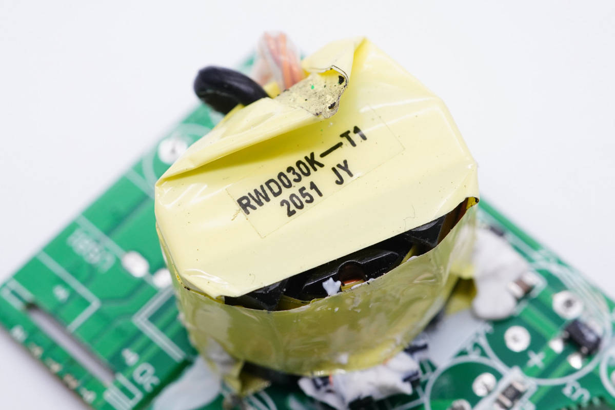 變壓器特寫,使用絕緣膠帶纏繞,頂部貼有信息標簽。