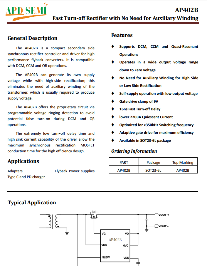 次級同步整流控制器采用成都矽力科技有限公司(APD-SEMI)的AP402B,耐壓120V,芯片自供電,無需附加繞組。其支持CCM/DCM/QR三種模式工作;支持PD3.0,PPS,QC3.0,QC4.0,QC4.0+各種快充模式輸出;支持正端接法和負端接法,外圍只有一個0.1uF電容。該控制器可以完全替換美國MPS的MP6908。