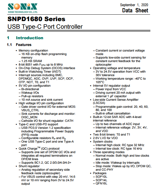SNPD1683采用SONiX專有的8051技術,內部為8位的8051處理器、與16 KB閃存存儲器,完整的Type-C USB-PD收發器,內置5V穩壓電路。D+/D-通訊支持QC和私有協議。支持光耦反饋輸出電壓,支持10mV精度調節輸出電壓,支持低端電流采樣,支持NMOS/PMOS輸出控制,內置放電管。
