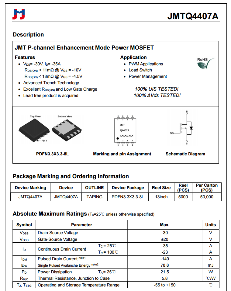 輸出VBUS開關管采用捷捷微JMTQ4407A,PMOS管,耐壓30V,PDFN3.3x3.3-8L。