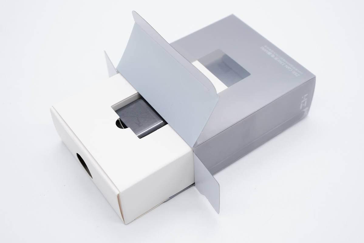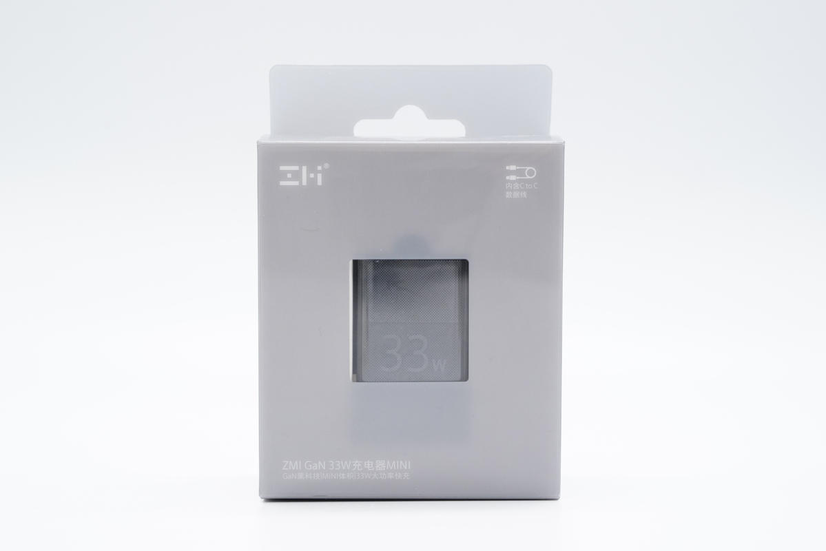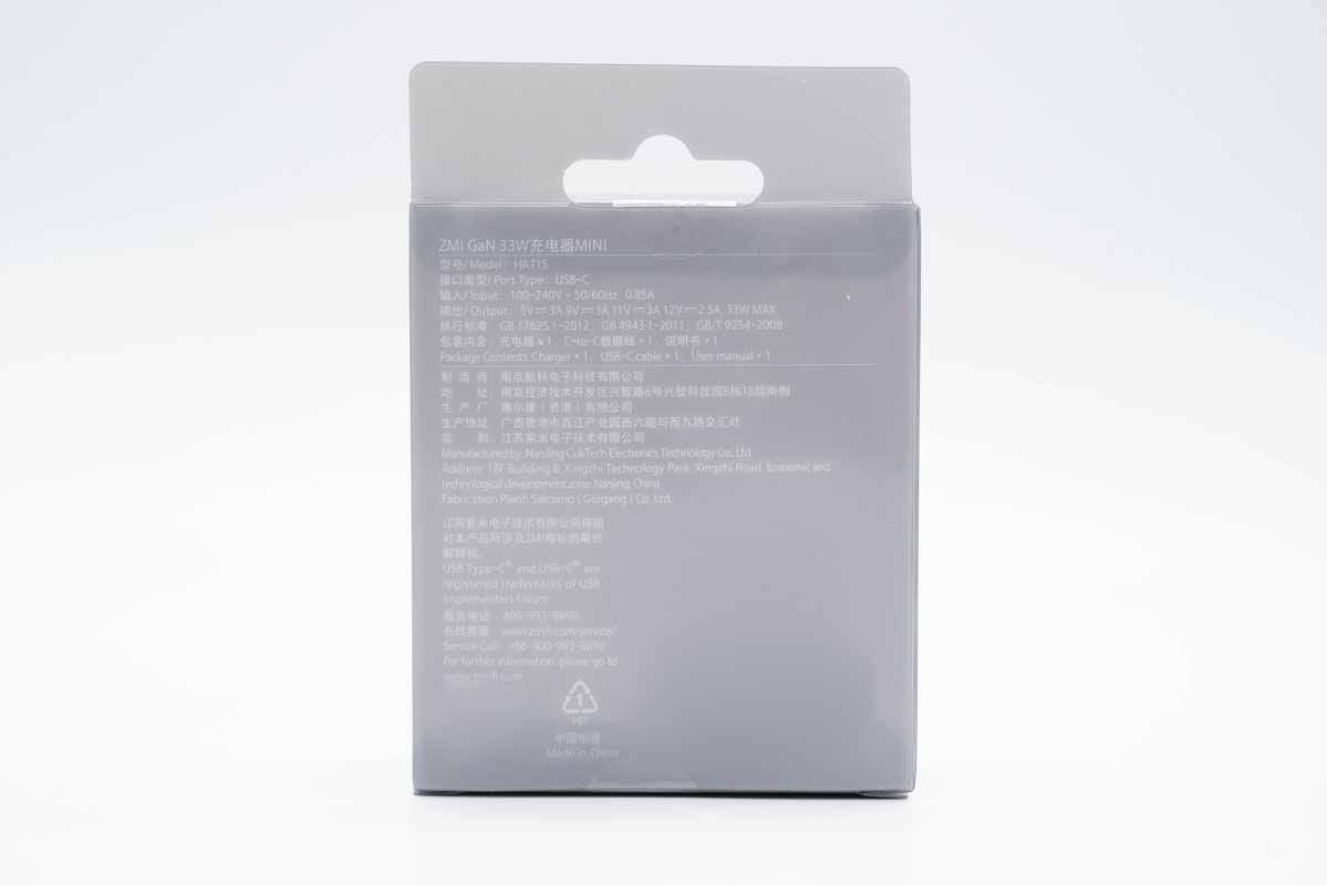 產品采用塑料外包裝盒,整體為灰色,頂部帶有掛鉤設計,正面中心透明處理,可以觀察充電器實體。此外正面上方印有ZMI logo以及CC數據線標識,下方印有充電器名稱。