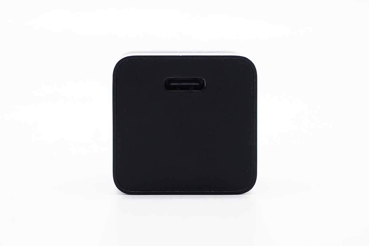 充電器采用PC阻燃材質黑色外殼,方塊造型設計,上下端切面且邊緣棱邊分明。