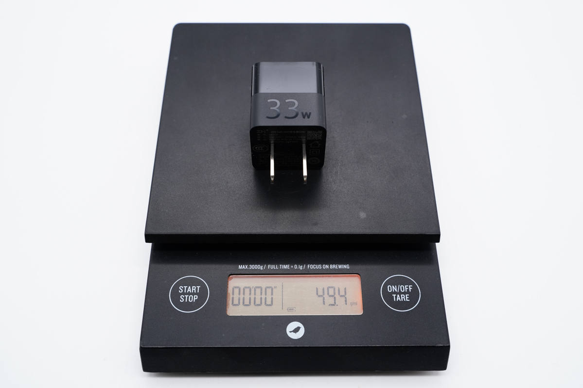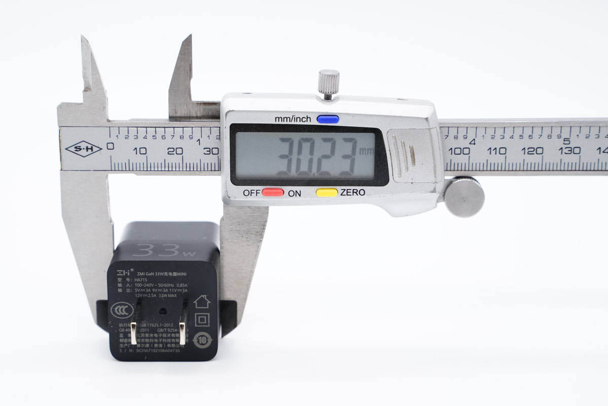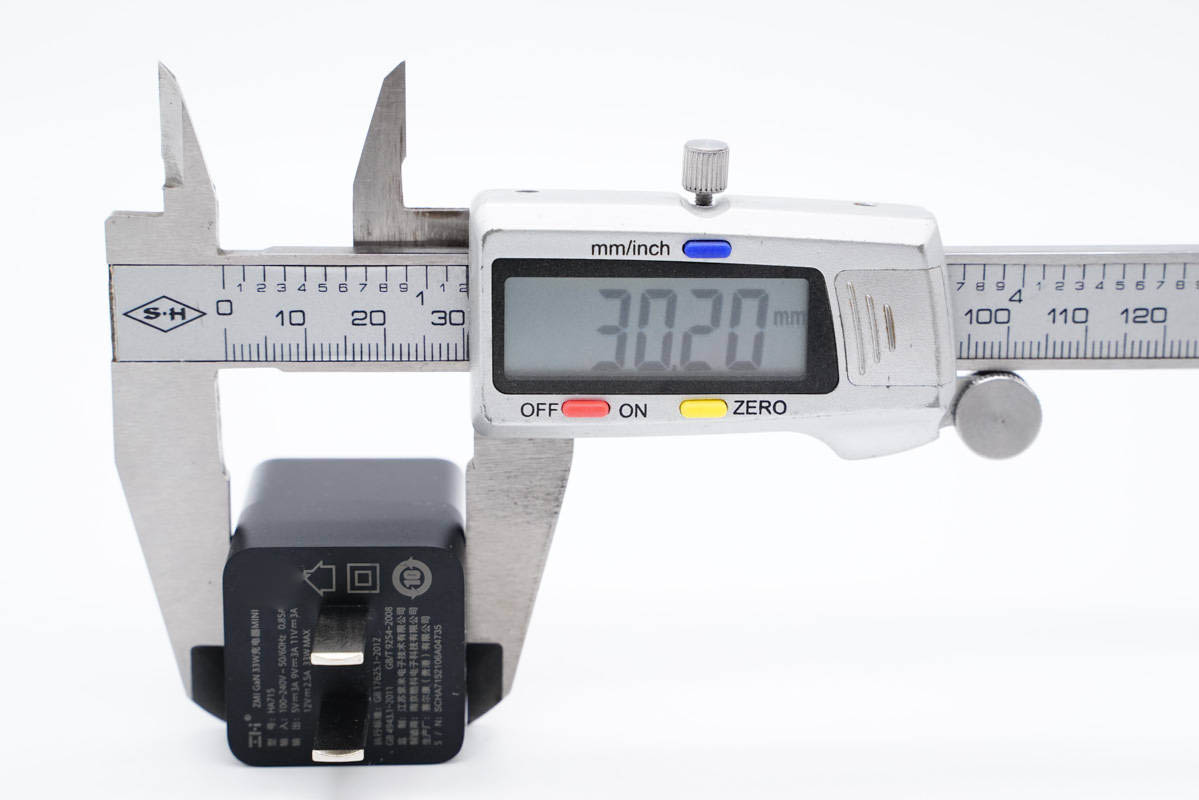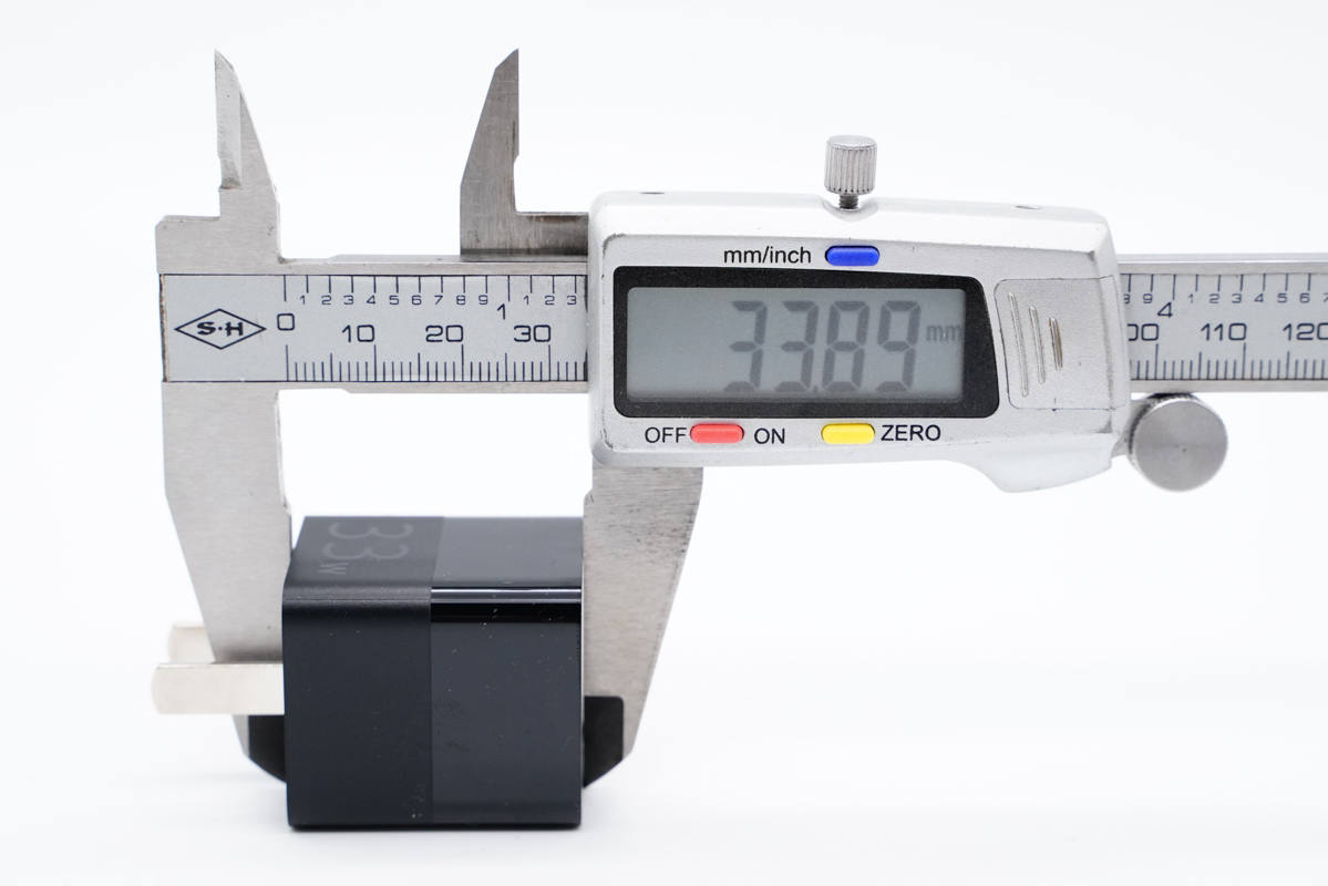使用游標卡尺實測充電器機身高度為33.89mm。