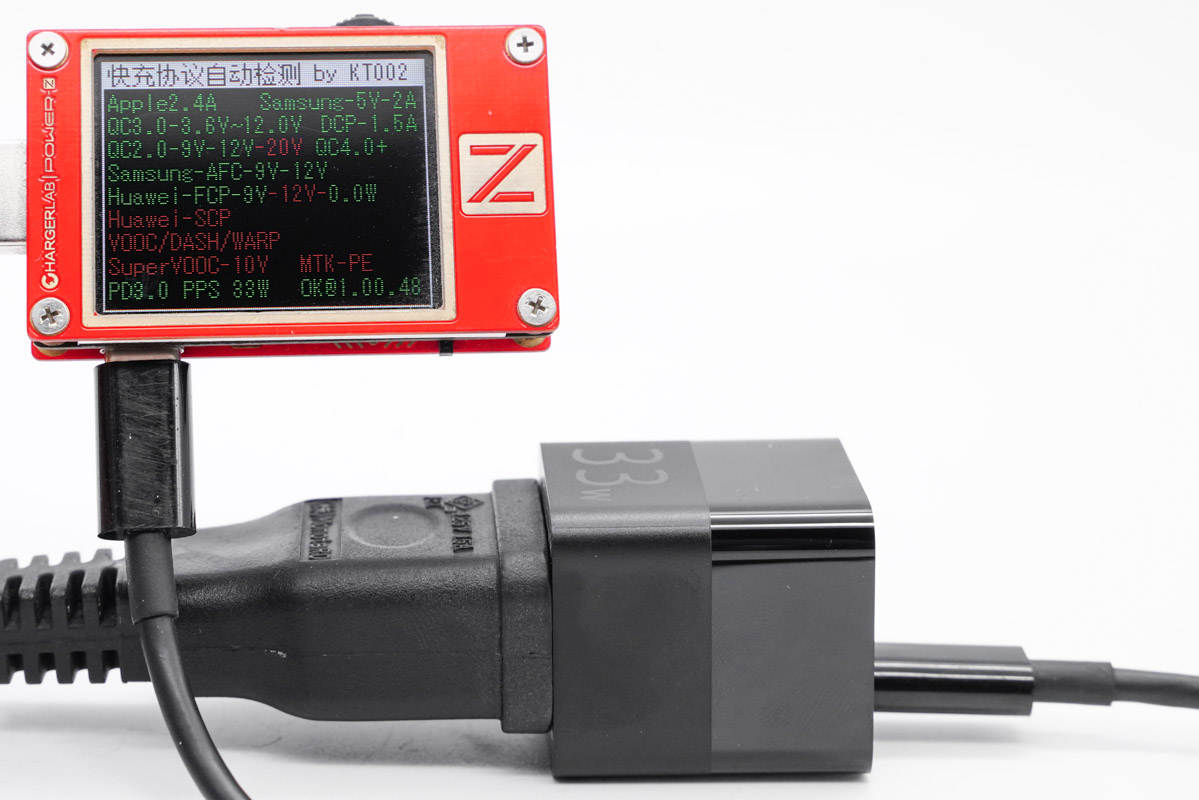 使用ChargerLAB POWER-Z KT002檢測USB-C口輸出協議,顯示支持Apple 2.4A、Samsung 5V2A和DCP協議,以及QC2.0/3.0、AFC、FCP、PD3.0、PPS快充協議。