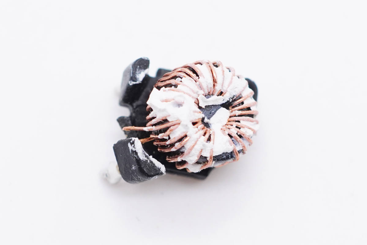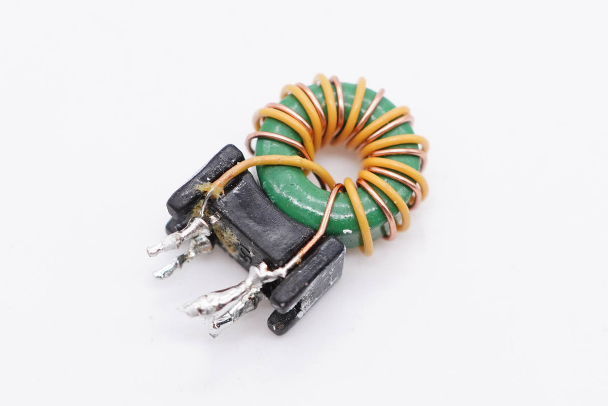 共模電感雙線繞制,并有塑料底座支撐,用于濾除EMI干擾。