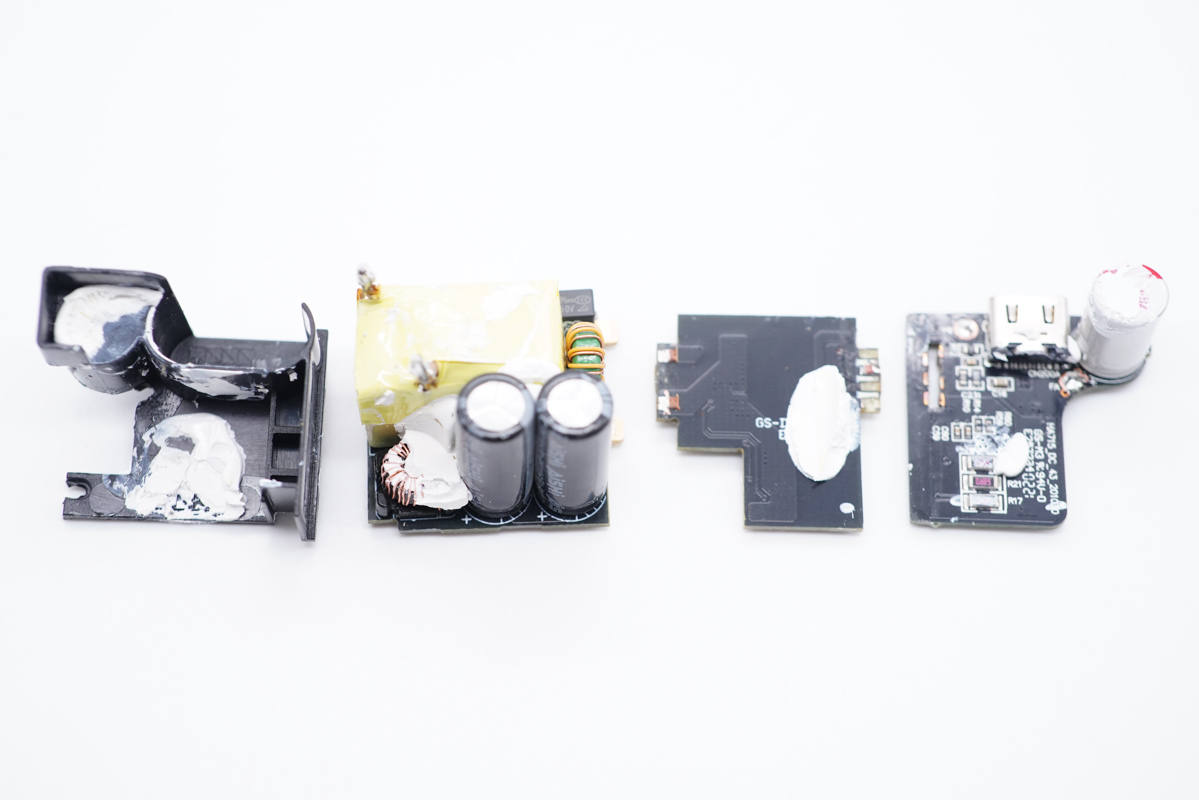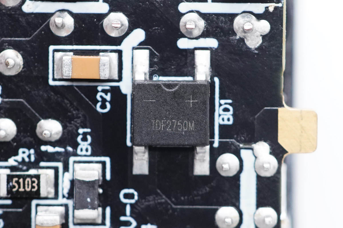 通過觀察發現,這款充電器采用時下熱門的多塊PCB板組合焊接設計方案,并且采用典型的反激開關電源寬范圍輸出,由協議芯片控制輸出電壓的架構。下面我們就從輸入端開始一一了解各元器件。