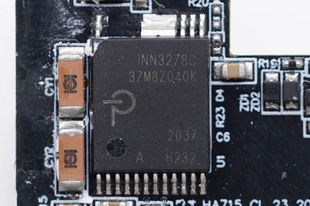 充電器主控芯片采用PI INN3278。這是一顆內部集成初級開關,同步整流控制器,反饋和恒功率特性的準諧振反激電源IC。其內部集成750V PowiGaN開關管,支持在密閉環境寬電壓范圍內輸出55W功率。小米33W充電器降額使用,可降低發熱。