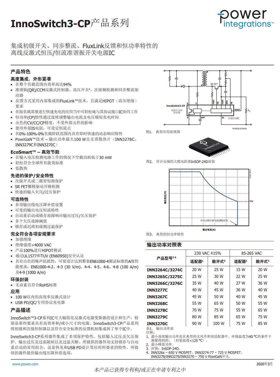 INN3278待機功耗小于30mW,支持次級整流管短路保護,支持同步整流管柵極開路檢測,具有快速的動態負載響應和輸入欠壓/過壓保護,并且內置完善全面的保護功能,適用于USB PD快充適配器。